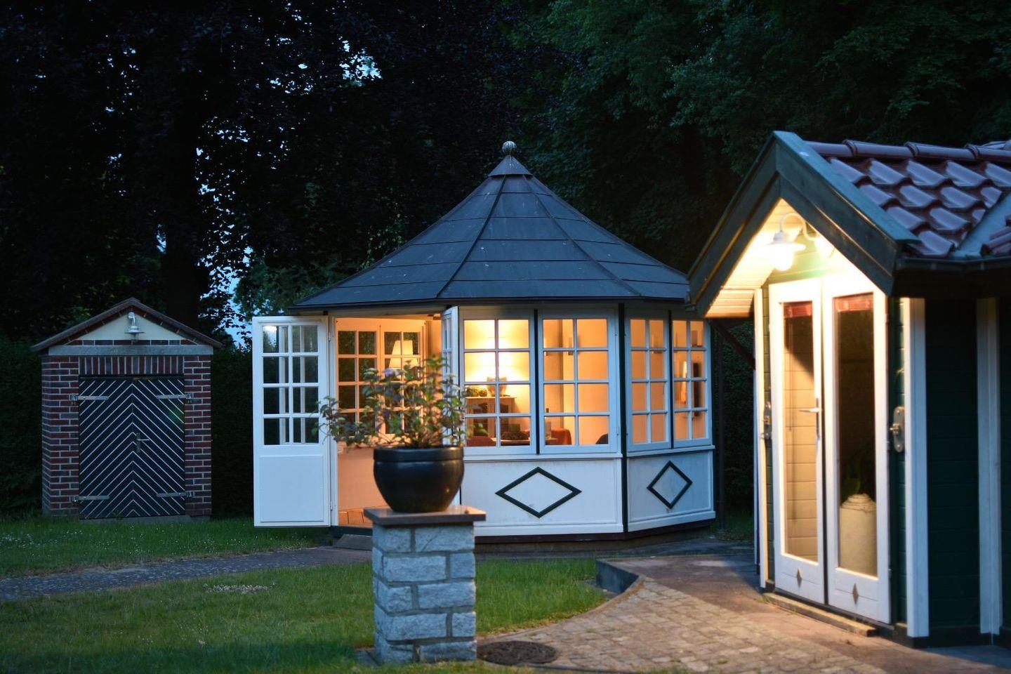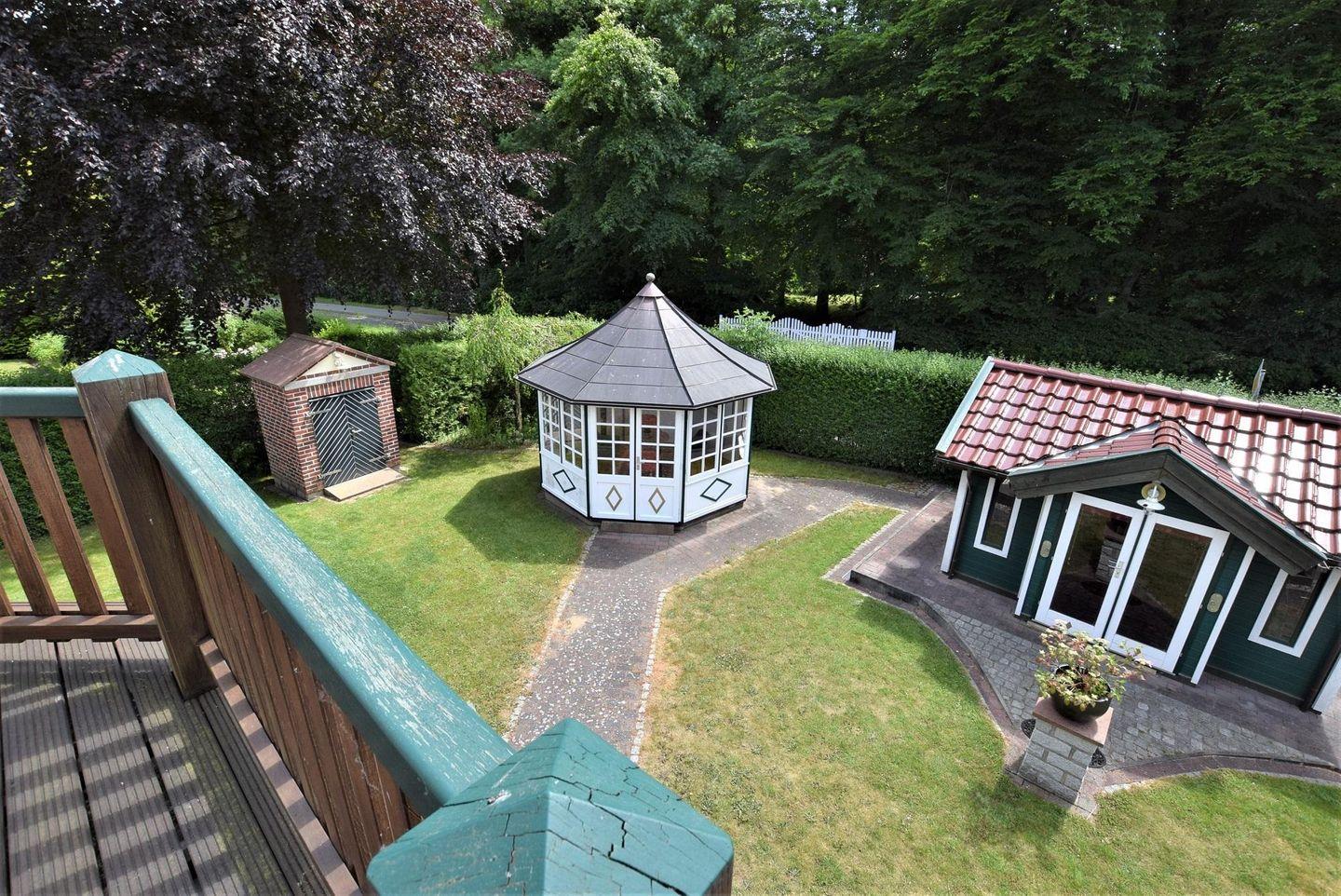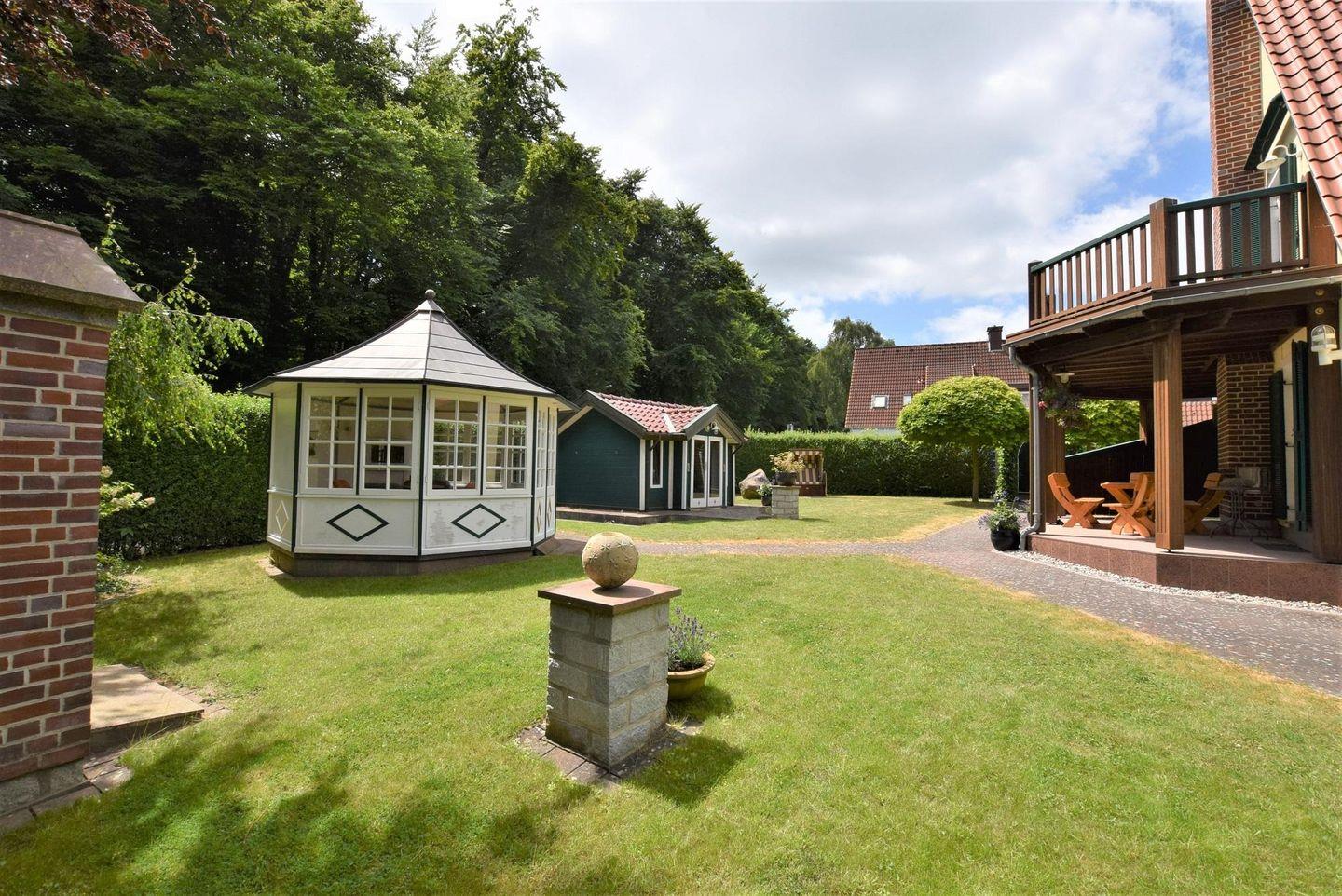 großer schön angelegter Garten mit Teehäuschen