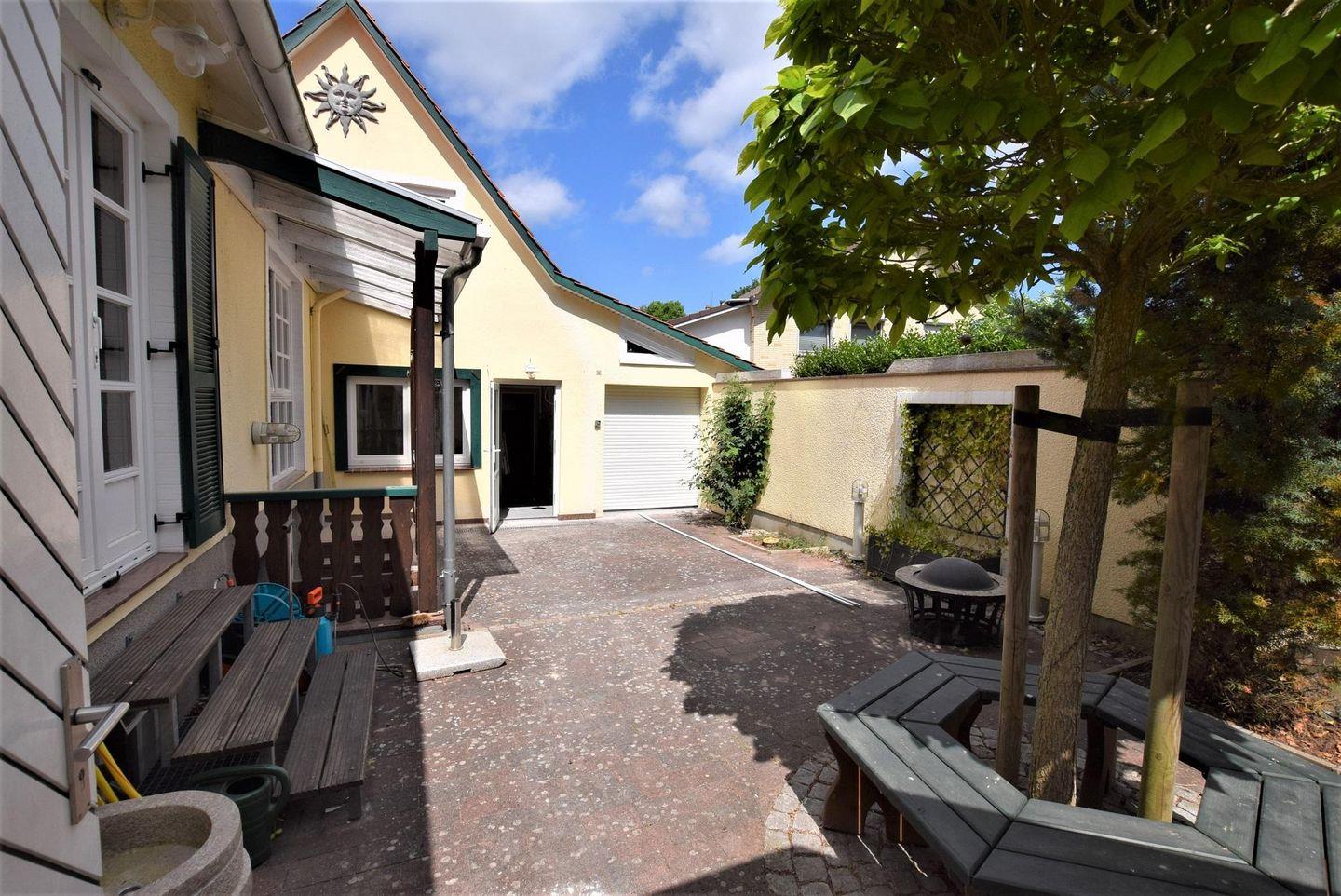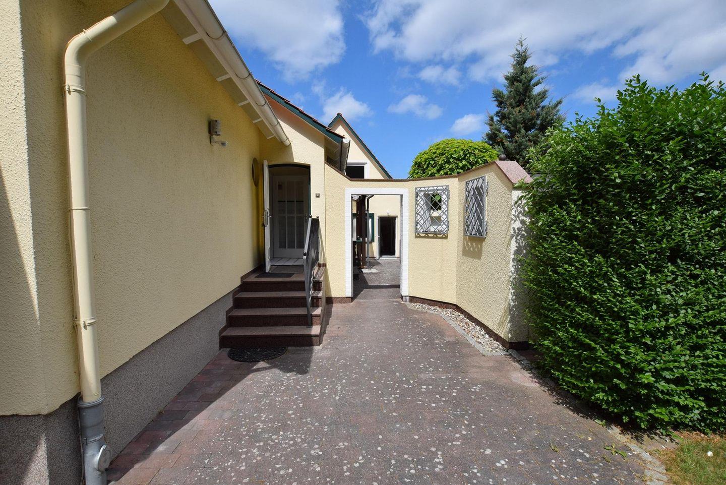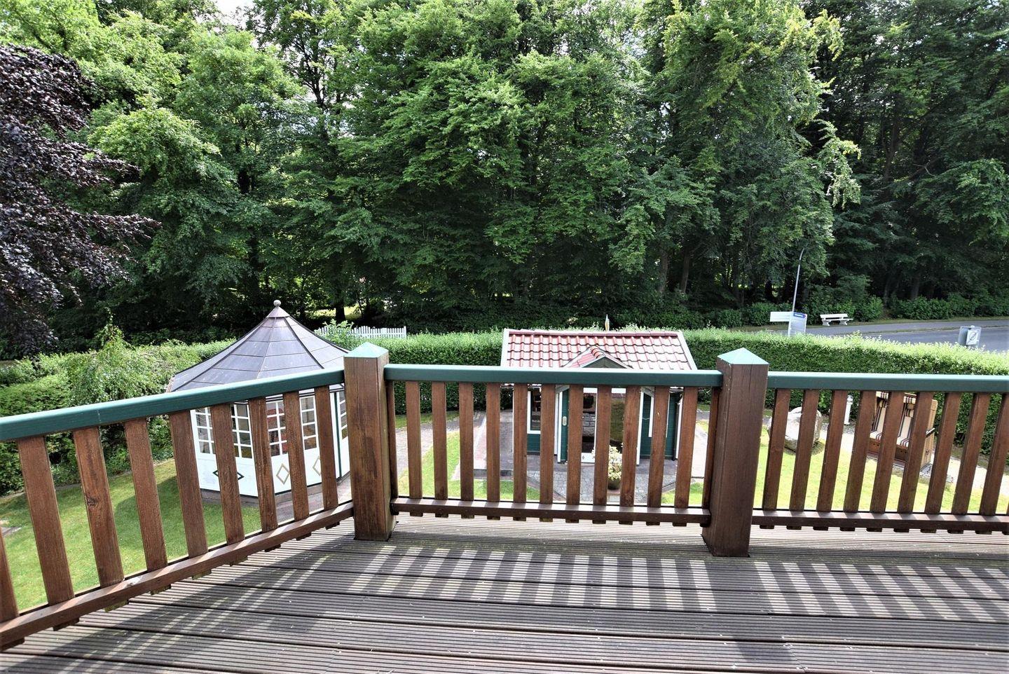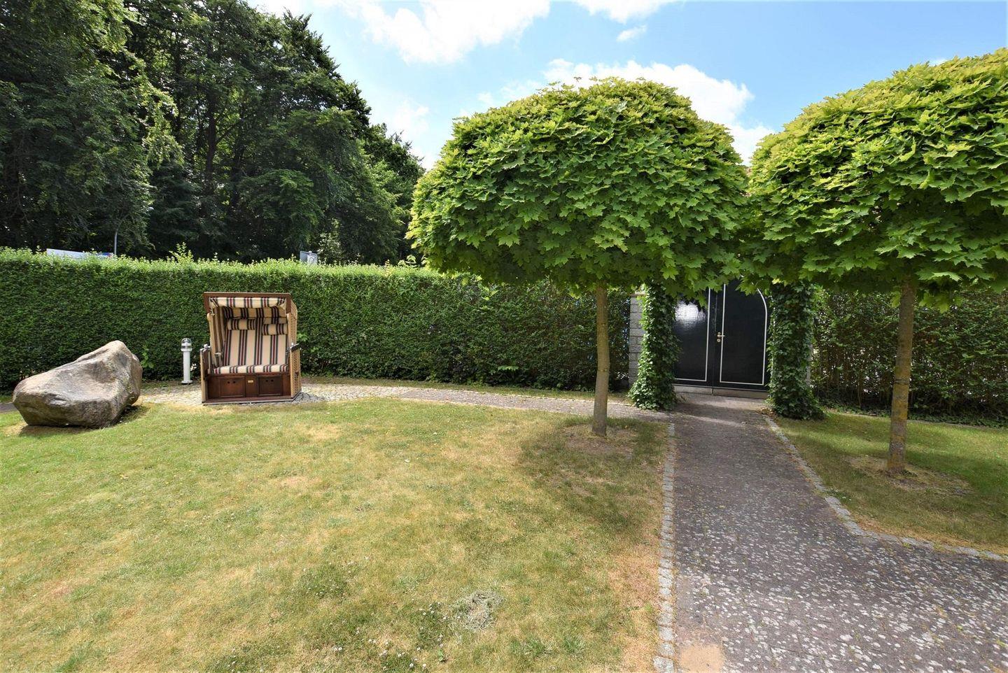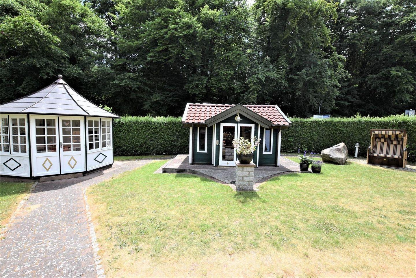 schönen Garten, wo ein Teehäuschen zum verweilen, grillen oder abends zum gemütlichen Beisammensein einlädt. Das Grundstück ist mit Rolltor und Hecke eingefriedet, so dass Sie einen Ort der Endspannung und Ruhe genießen können.