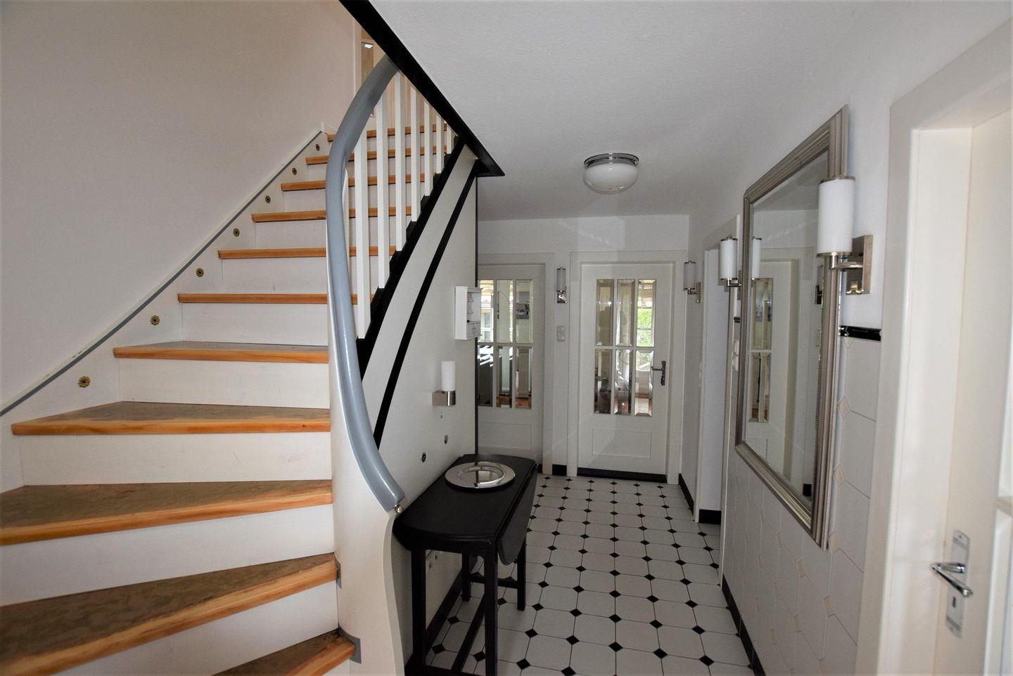 Flur mit Garderobe, gemütliches Wohnzimmer mit Kachelofen und Fernseher sowie Google - Assistent - Lautsprecher, Lesezimmer mit Bücher und Spielen, Bad mit Dusche und Badewanne, Einzelzimmer mit Boxsping Bett 1,40 x 2,00 m, Doppelzimmer mit Boxspring Bett 1,80 x 2,00 m, Esszimmer mit großem Esstisch für 8 Personen und Küche voll ausgestattet mit