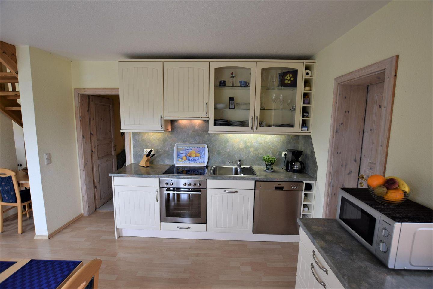 offene Küche: Ceran-Herd mit Backofen, Mikrowelle, Kühlschrank mit Gefrierfach,