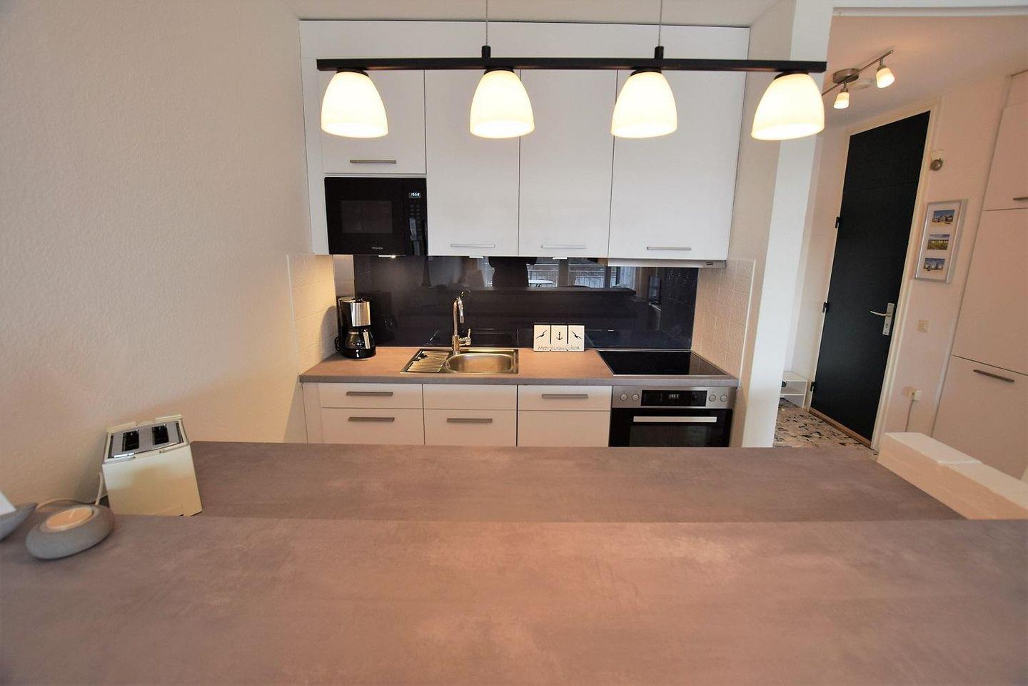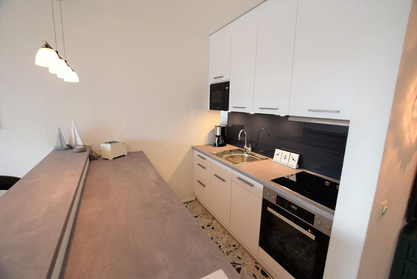 Offene Küche mit Elektroherd, Backofen, Mikrowelle Kaffeemaschine, Kühlschrank mit Gefrierfach, Wasserkocher, Toaster uvm.