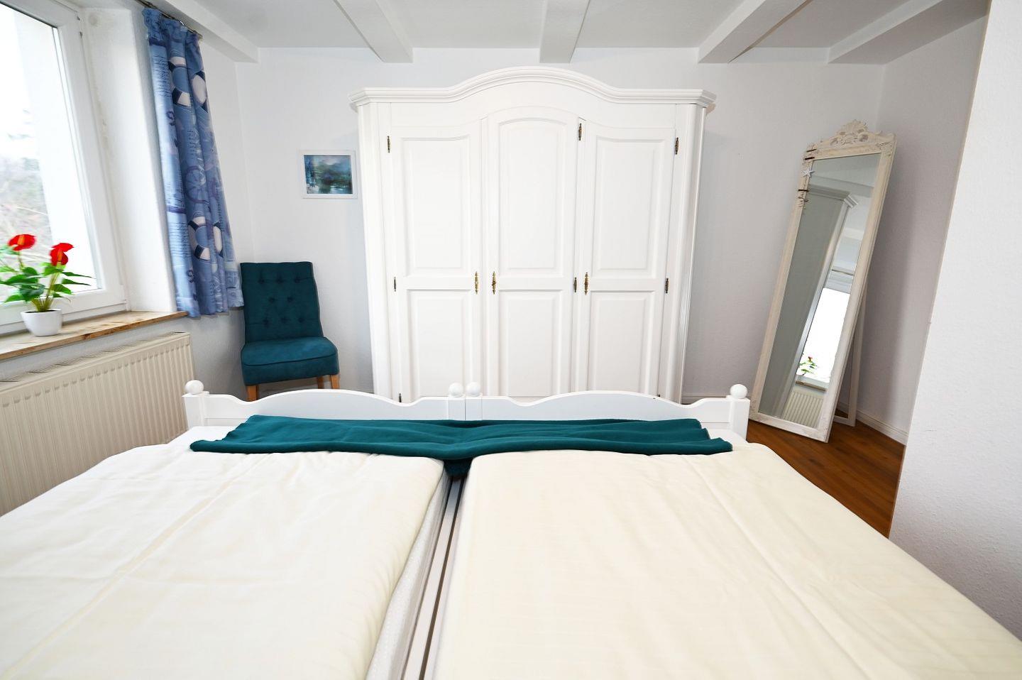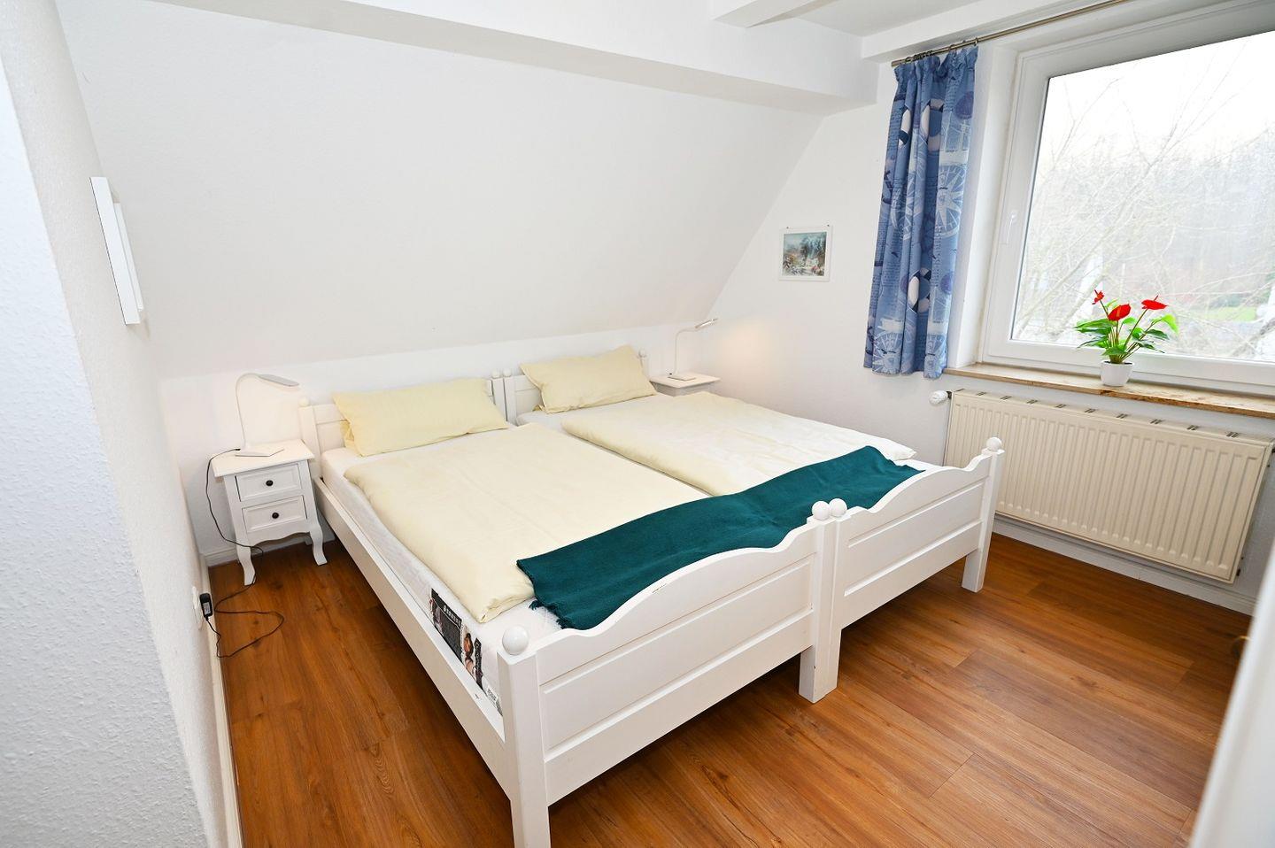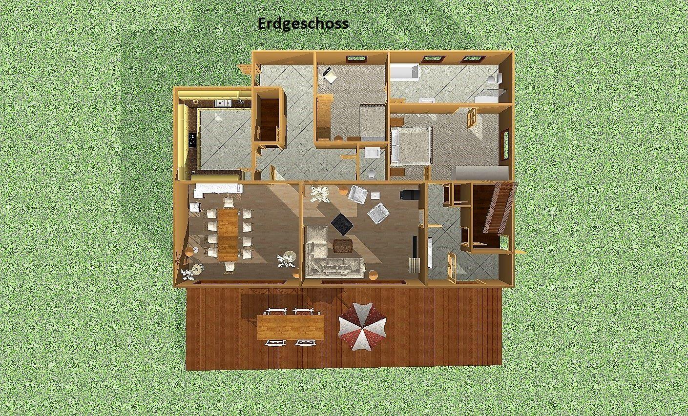 Neben den genannten Räumlichkeiten befinden sich im Erdgeschoss 2 Schlafzimmer. Eines der Schlafzimmer ist mit einem großen Doppelbett ausgestattet (200x200 cm). Das zweite Schlafzimmer verfügt über ein Einzelbett (90x200 cm). Zudem befindet sich unmittelbar angrenzend an die beiden Schlafzimmer ein großes Badezimmer mit Dusche, Badewanne, WC und Waschbecken. Zusätzlichen Komfort bietet das Gäste-WC im Erdgeschoss des Hauses.