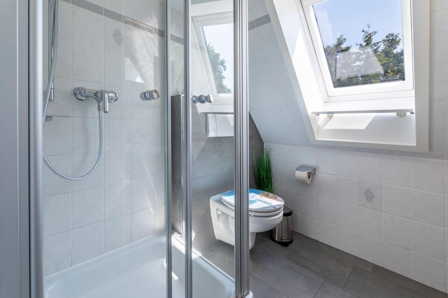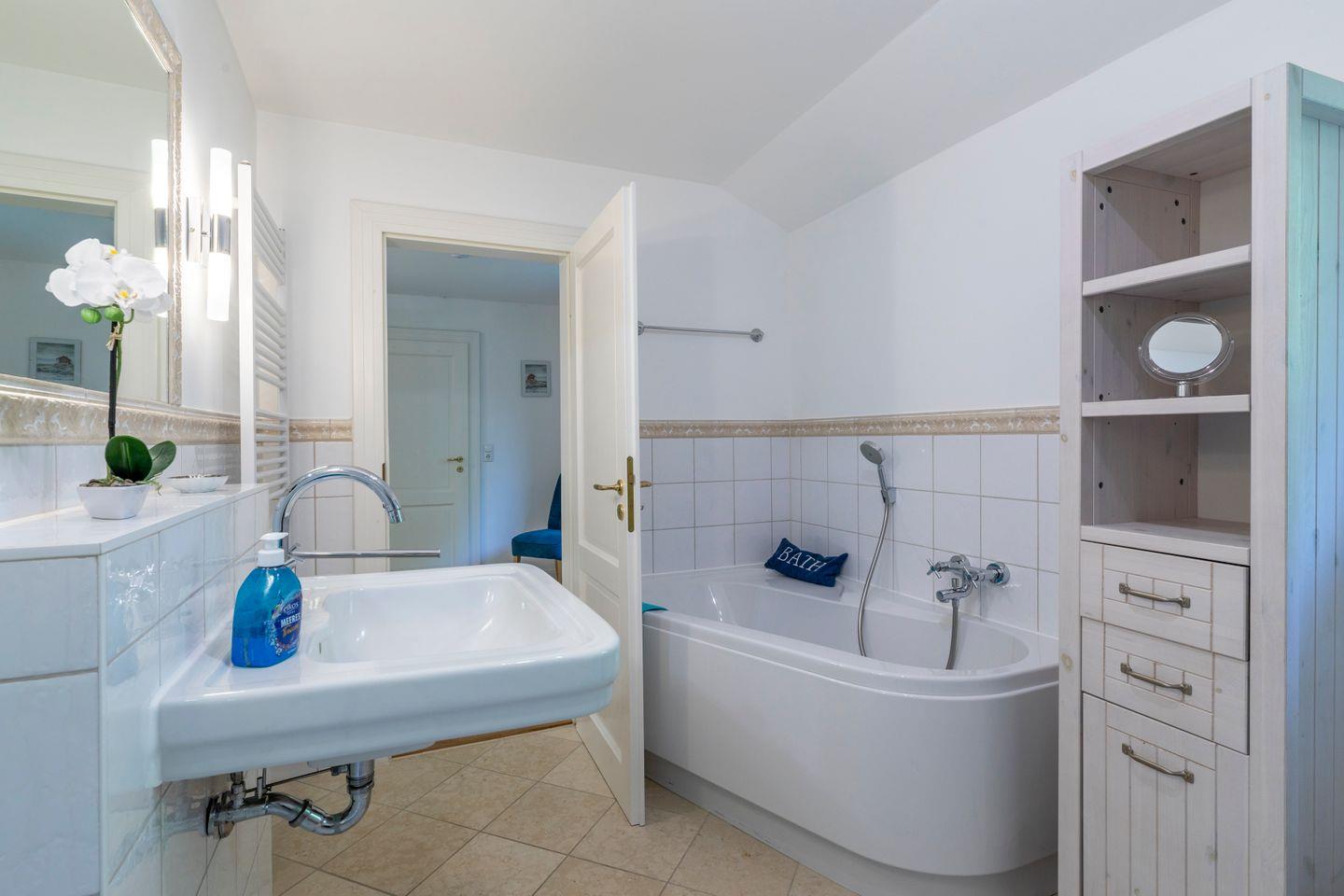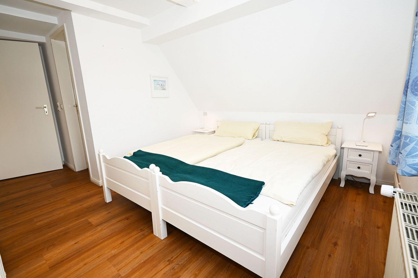 Neben den genannten Räumlichkeiten befinden sich im Erdgeschoss 2 Schlafzimmer. Eines der Schlafzimmer ist mit einem großen Doppelbett ausgestattet (200x200 cm). Das zweite Schlafzimmer verfügt über ein Einzelbett (90x200 cm). Zudem befindet sich unmittelbar angrenzend an die beiden Schlafzimmer ein großes Badezimmer mit Dusche, Badewanne, WC und Waschbecken. Zusätzlichen Komfort bietet das Gäste-WC im Erdgeschoss des Hauses.