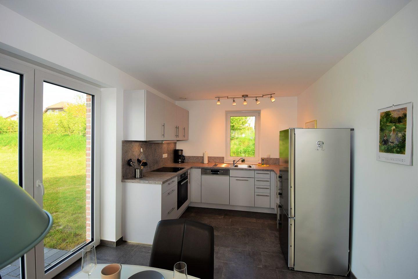 Der großzügige Wohnraum mit offener Küche ist lichtdurchflutet durch eine große Fensterfront zur Terrasse und lädt zum Verweilen ein. Hier können Sie auf dem gemütlichen Sofa entspannen und Ihre Lieblingssendung auf dem TV genießen oder mit Freunden und Familie am Esstisch klönen und schlemmen.