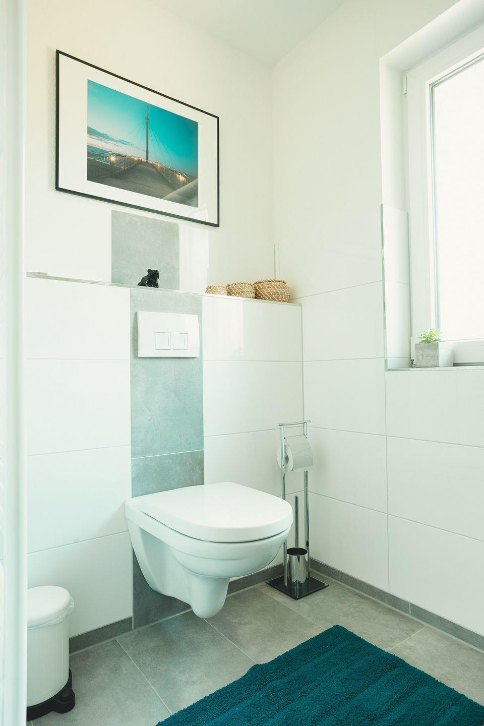 Die Küche ist offen gestaltet und doch ein wenig zurückgesetzt platziert, so dass im Wohnraum viel Fläche für Bewegungsfreiraum sorgt. Die Küche selbst ist ebenso modern eingerichtet und gestaltet wie der Rest des Wohnbereichs. Durch ihre L-Form ist sie besonders geräumig und mit viel Arbeitsfläche ausgestattet. Neben dem Kühlschrank mit Gefriermöglichkeit finden sich hier auch Spülmaschine, Ceranherd mit Backofen, Kaffeemaschine, Toaster, Wasserkocher sowie Geschirr, Gläser und Besteck. Ein zusätzlicher Hauswirtschaftsraum mit Waschmaschine ist ebenfalls vorhanden.