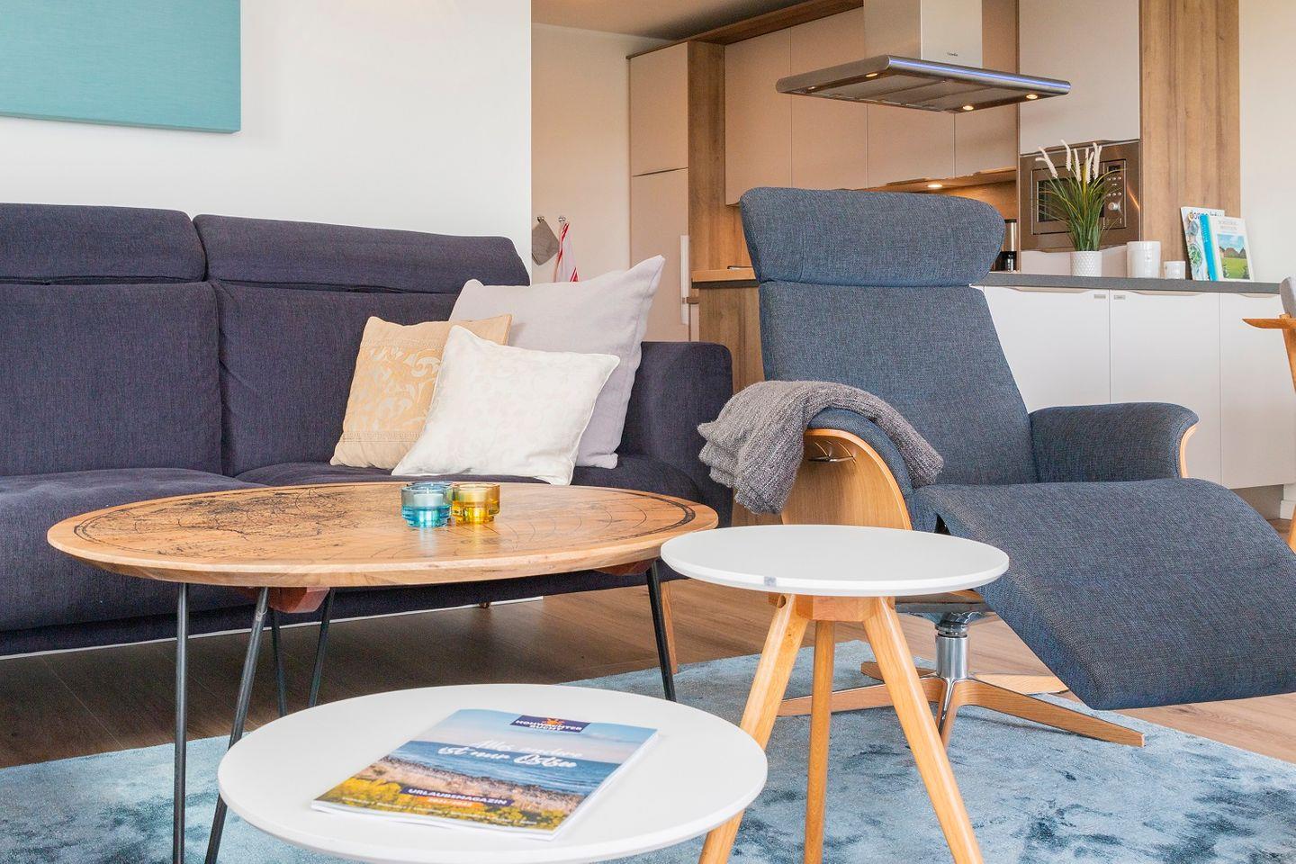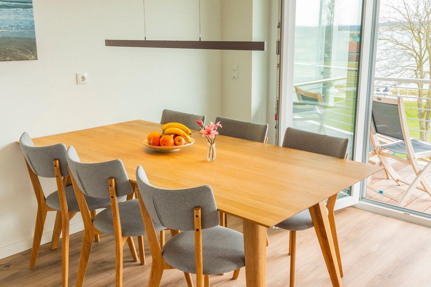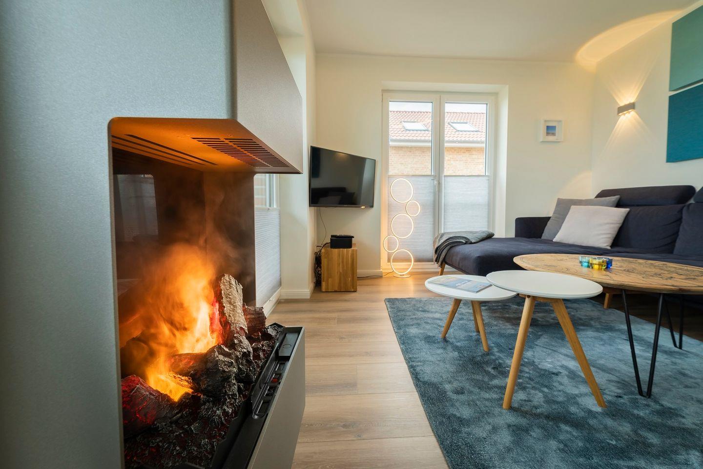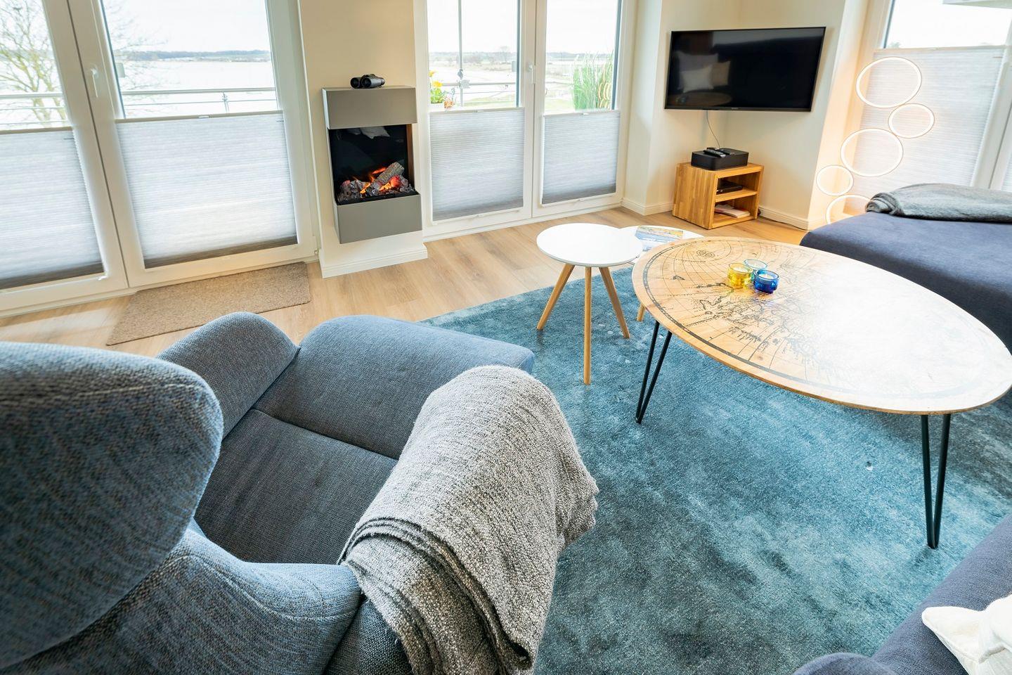 Der helle Wohnraum der Ferienwohnung "Schöne Aussicht" verfügt über eine große Fensterfront, hinter welcher sich der schöne Balkon der Wohnung erstreckt. Direkt davor befindet sich das gemütliche Sofa und Esstisch, die nach einem langen Tag am Meer zum Entspannen einladen. Ein großer Fernseher sorgt für Unterhaltung wenn gewünscht. Ein Elektro-Kamin sorgt am Abend für zusätzliche Gemütlichkeit.