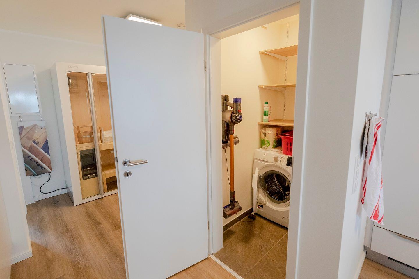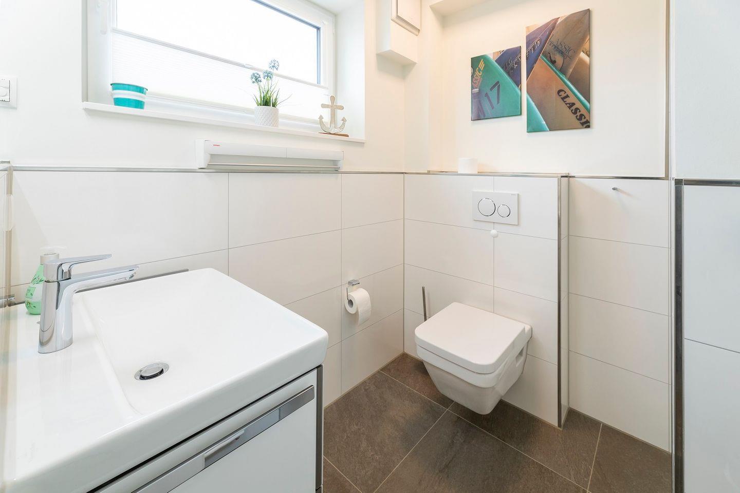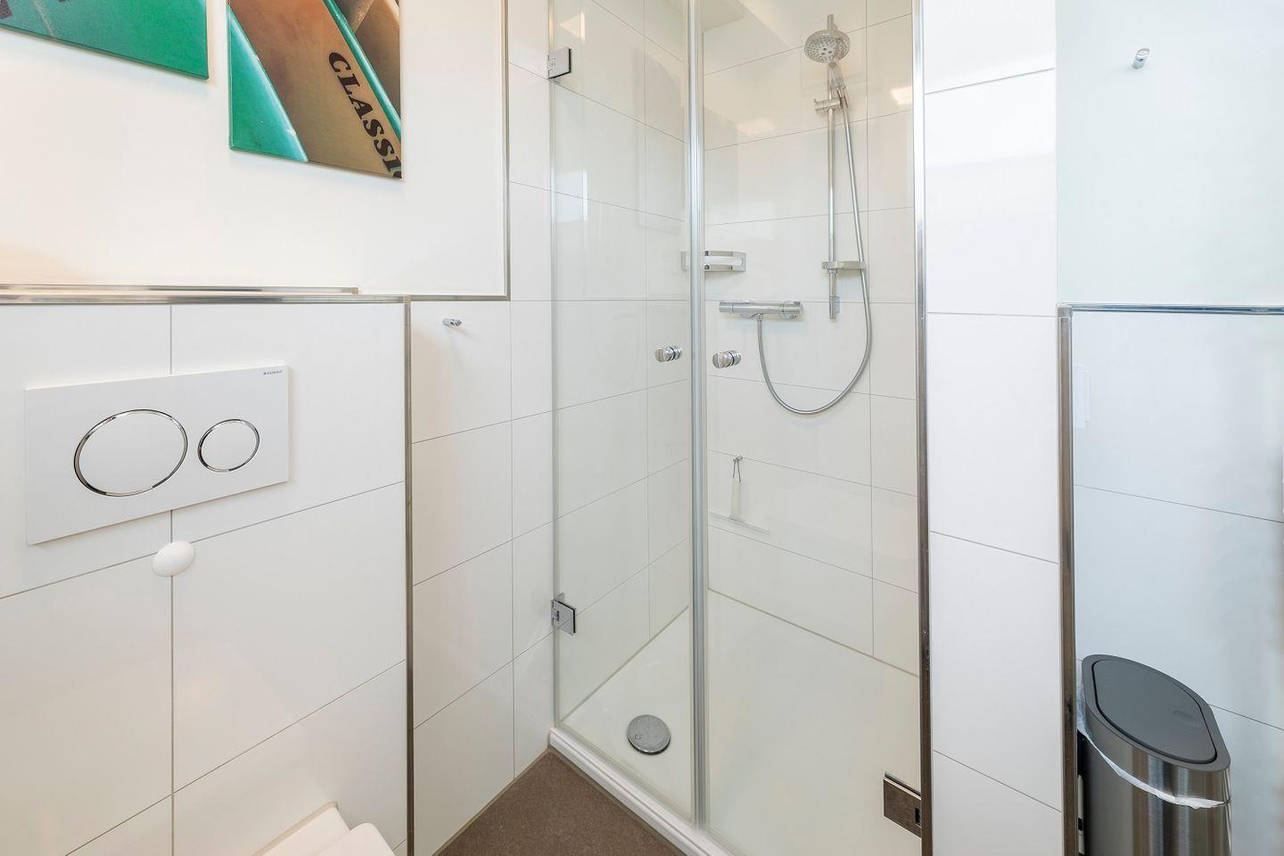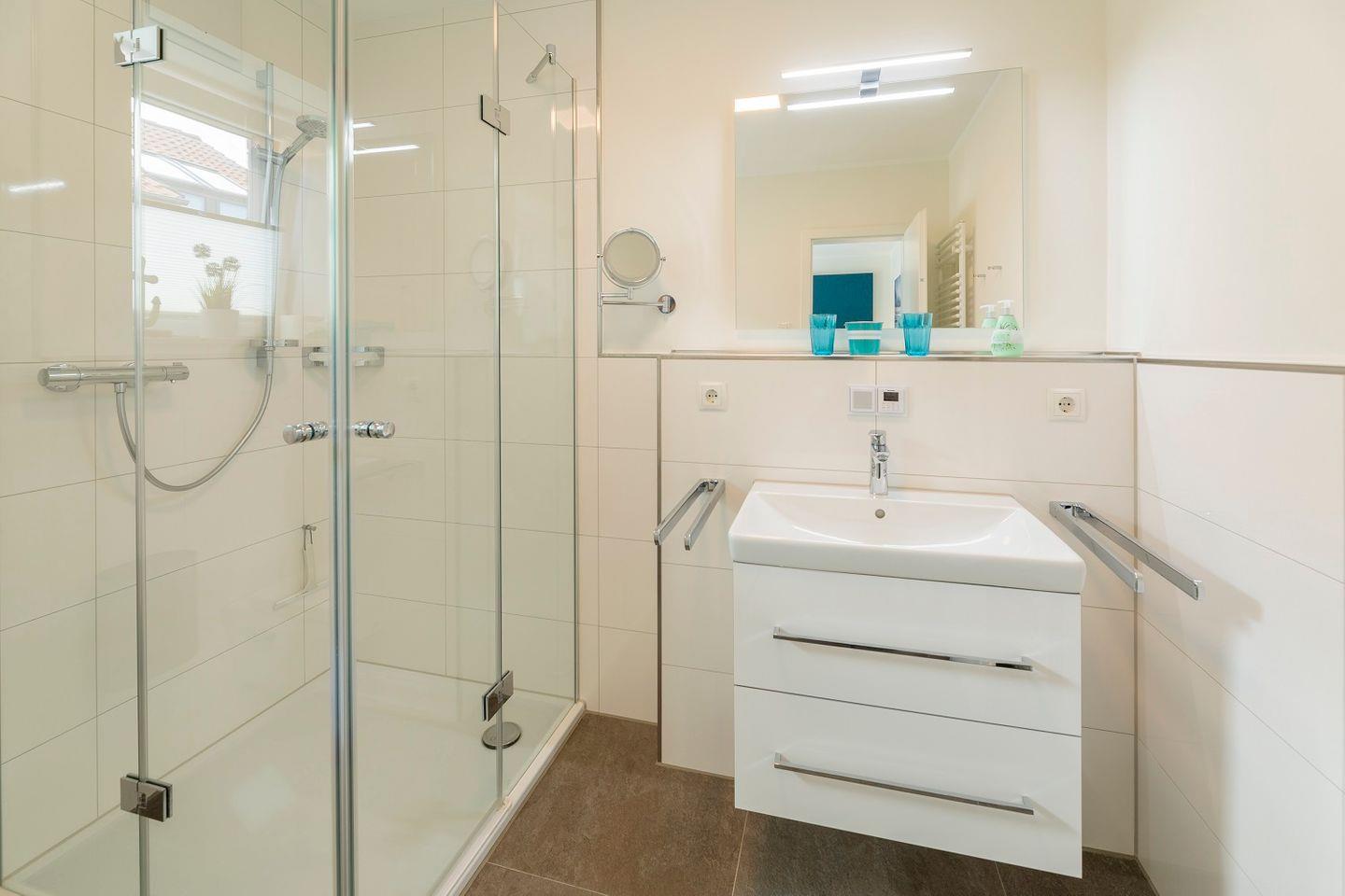 Die Duschen sind bodentief und lassen sich mit einer Glastür verschließen. Helle Fliesen sorgen für einen modernen Gesamteindruck. Deckenspots, ein Waschtisch mit großem Spiegel und ein Fön sind hier ebenso vorhanden wie ein Handtuchwärmer.