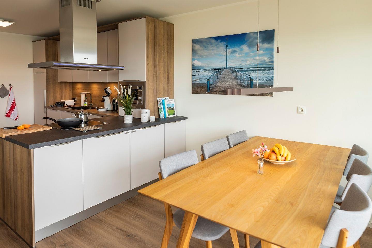 Ebenfalls in dem Wohnraum integriert sorgt die offene Küche mit Koch-Insel für eine moderne Raumaufteilung.