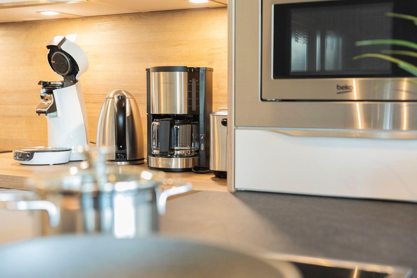 Die Küche ist umfassend ausgestattet und bietet ausreichend Arbeitsfläche, um im Urlaub auch mal anspruchsvoller zu kochen.