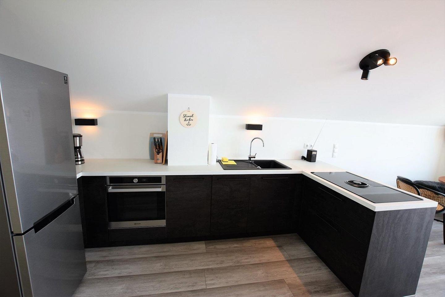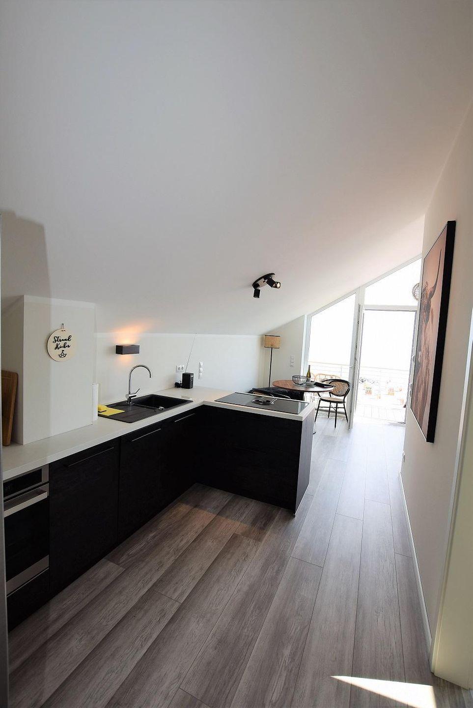 Der helle Wohnraum mit großer Fensterfront und Zugang zum schönen Balkon teilt sich in einen Wohnbereich und eine Essecke mit angrenzender Küchenzeile. Diese ist modern und offen gestaltet und perfekt ausgestattet: So finden Sie hier neben einem Geschirrspüler auch den Induktionsherd mit integriertem Dunstabzug sowie einen Backofen, Kühlschrank mit Gefriermöglichkeit und zahlreiche weitere Küchenutensilien. Ein Toaster und eine Kaffemaschine sowie ein Wasserkocher sind natürlich ebenfalls vorhanden. Durch ihre L-Form bietet die Küchenzeile zudem reichlich Arbeitsfläche und vom Herd einen wunderschönen Blick aufs Wasser. Am runden Esstisch ist Platz für alle Gäste der Unterkunft. Der Wohnbereich ist mit einem bequemen Boxspring-Sofa und Flachbildschirm mit Kabelfernsehen zeitgemäß ausgestattet und lädt zum Verweilen ein.