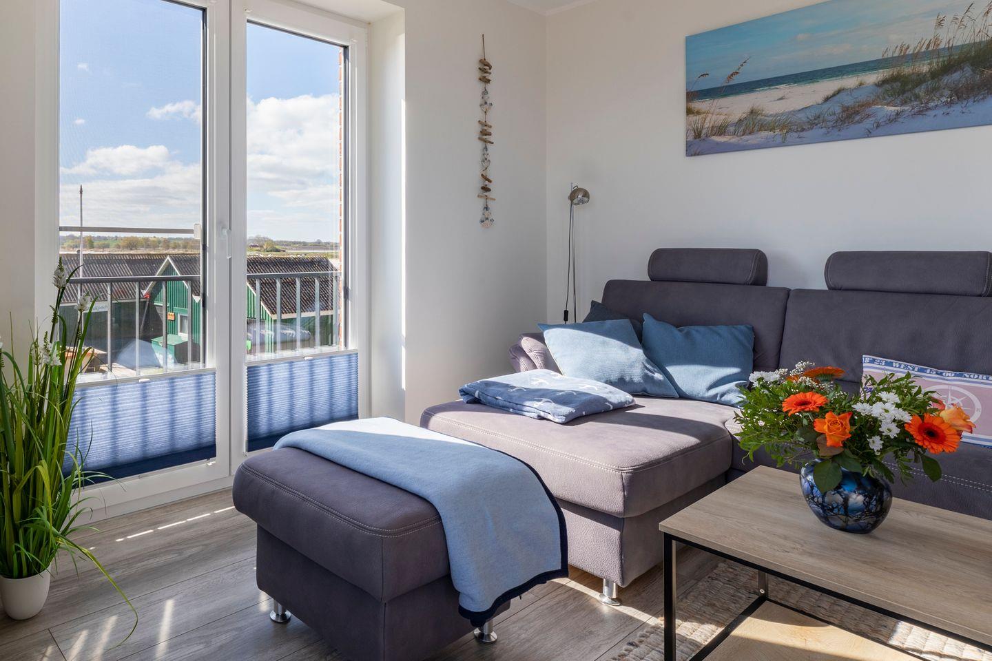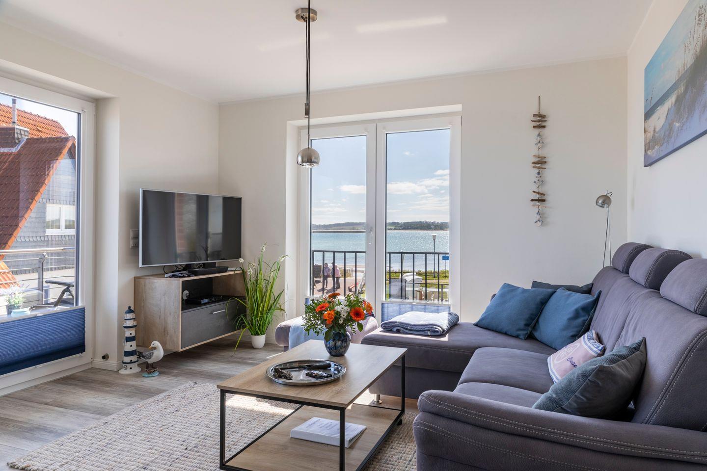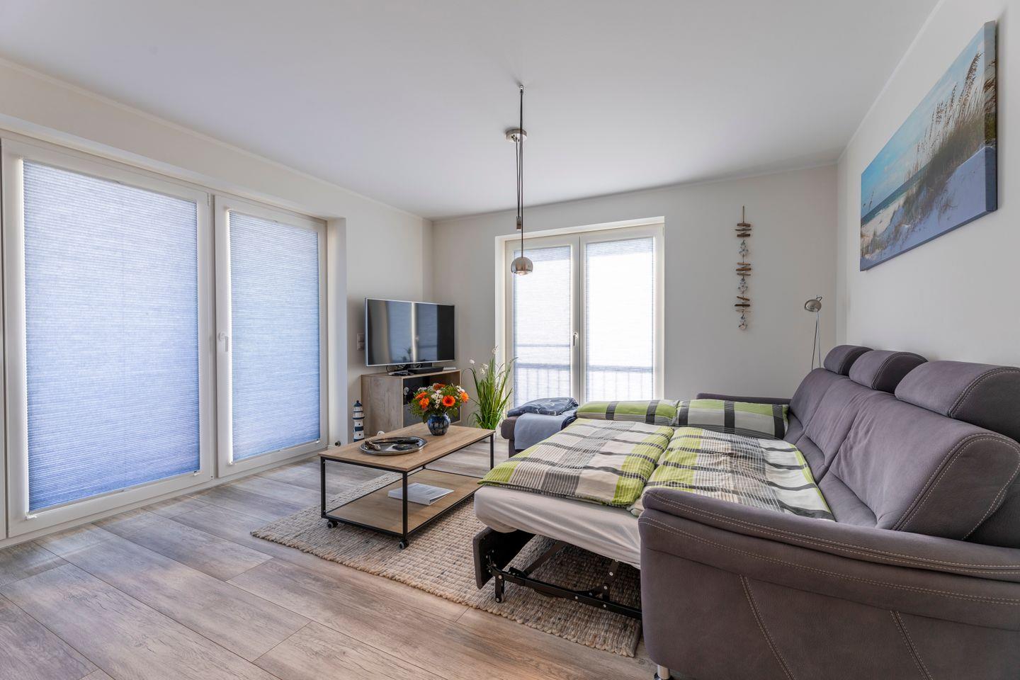 Das Wohnzimmer ist weitläufig und mit einem direkten Zugang zum schönen Balkon ausgestattet. Große Fenster und die doppelflüglige Terrassentür mit Fliegenschutztür sorgen dafür, dass der Raum besonders hell und luftig erscheint. Der Blick kann hier aus allen Fenster auf den wunderschönen, weißen Strand und die tiefblaue Ostsee fallen.