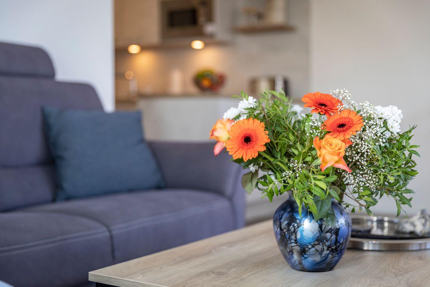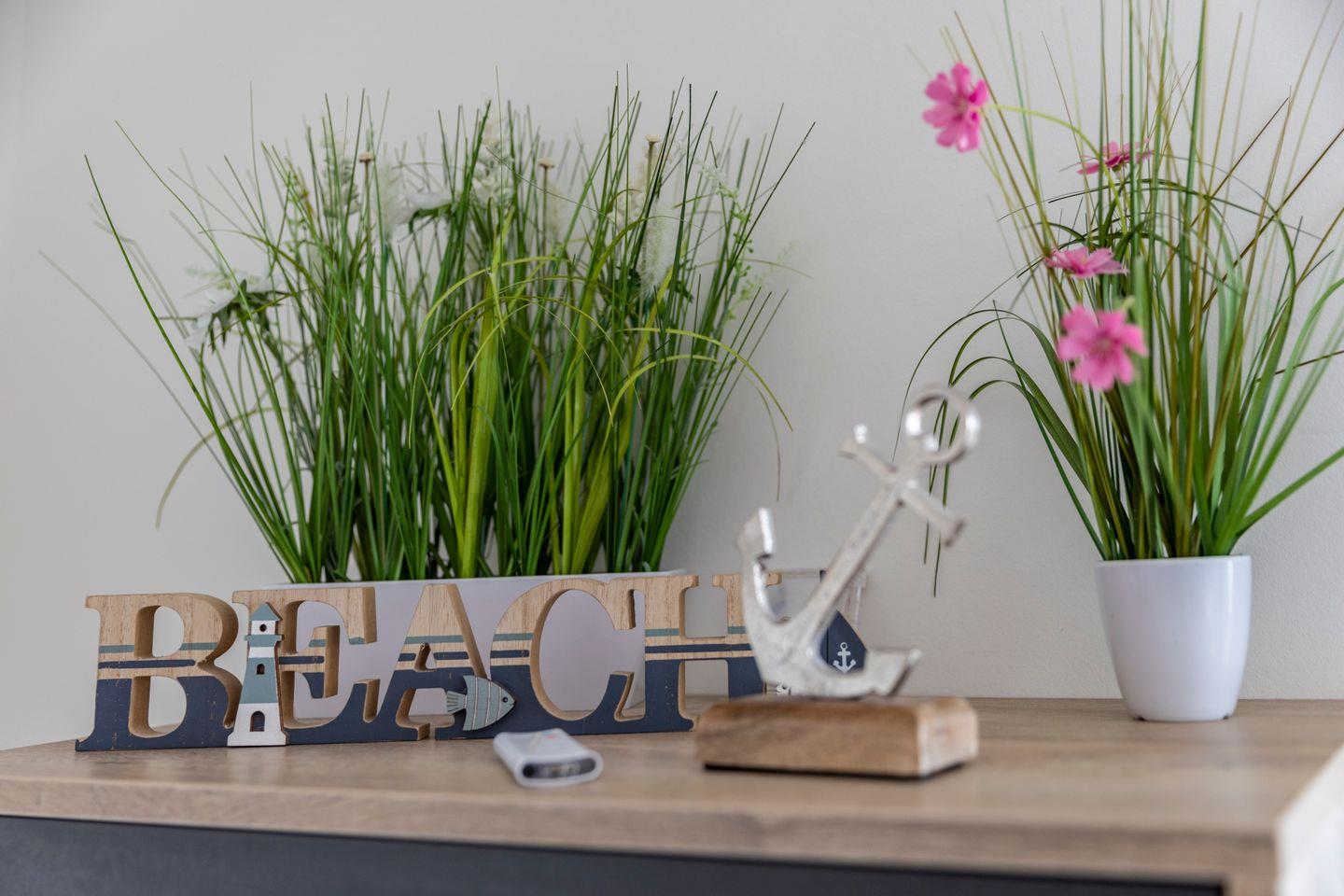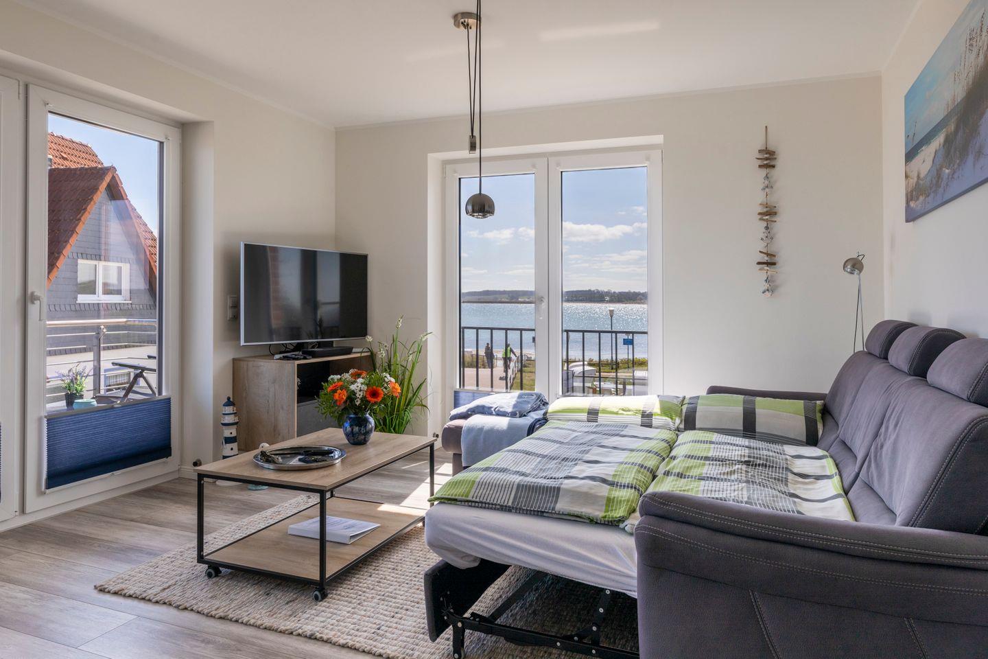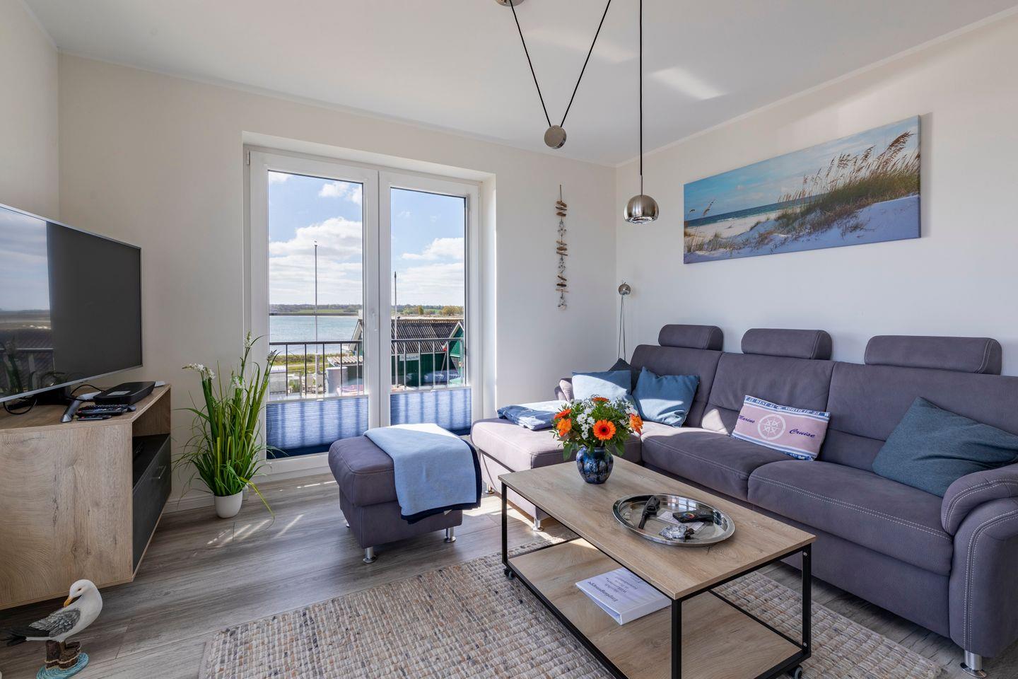 Das Wohnzimmer ist weitläufig und mit einem direkten Zugang zum schönen Balkon ausgestattet. Große Fenster und die doppelflüglige Terrassentür mit Fliegenschutztür sorgen dafür, dass der Raum besonders hell und luftig erscheint. Der Blick kann hier aus allen Fenster auf den wunderschönen, weißen Strand und die tiefblaue Ostsee fallen.