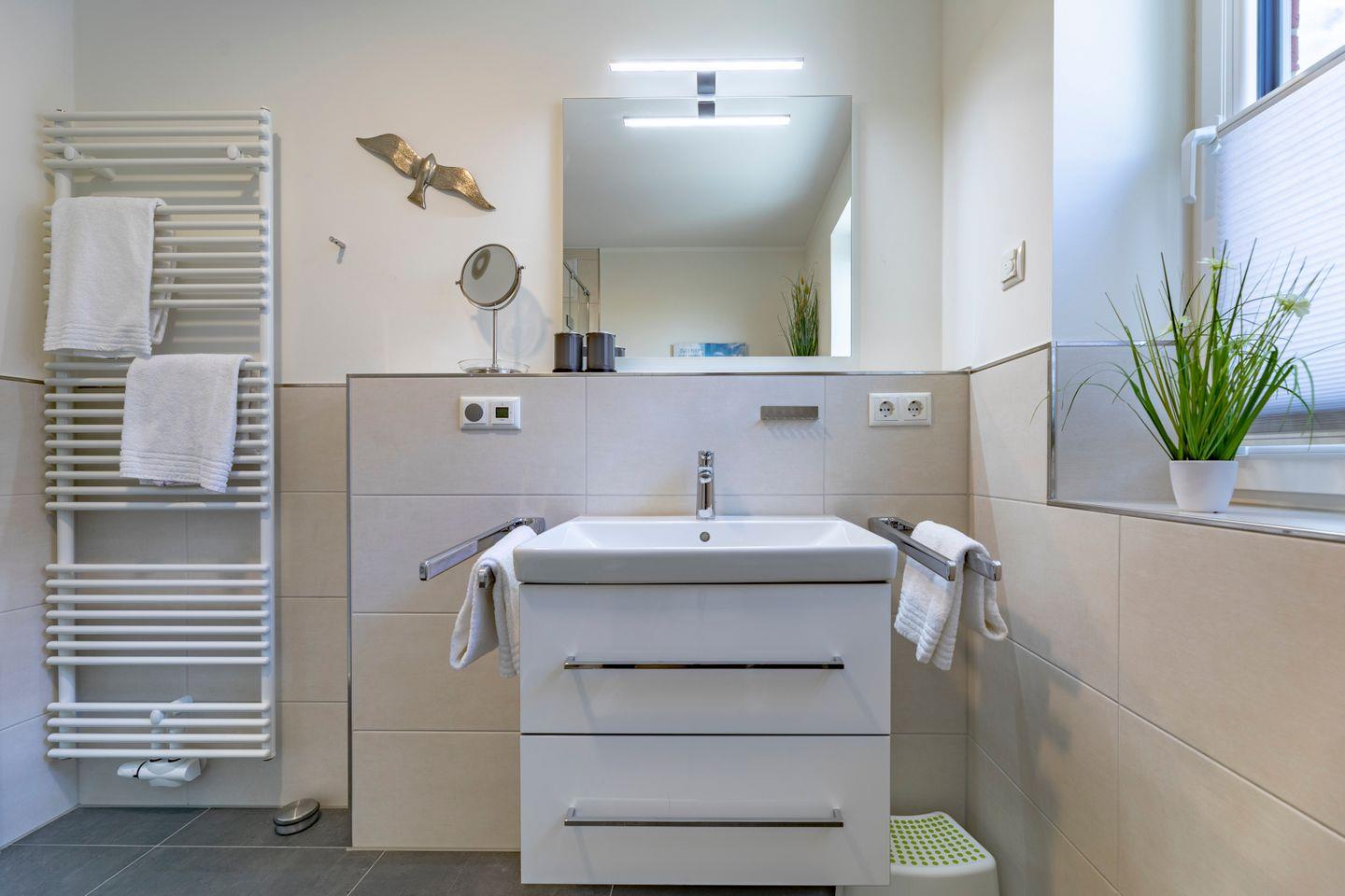 Diese Unterkunft verfügt über ein Vollbad mit Waschtisch, Dusche und WC. Die Beleuchtung mit Deckenspots und der Handtuchhalter sorgen für modernen Komfort.