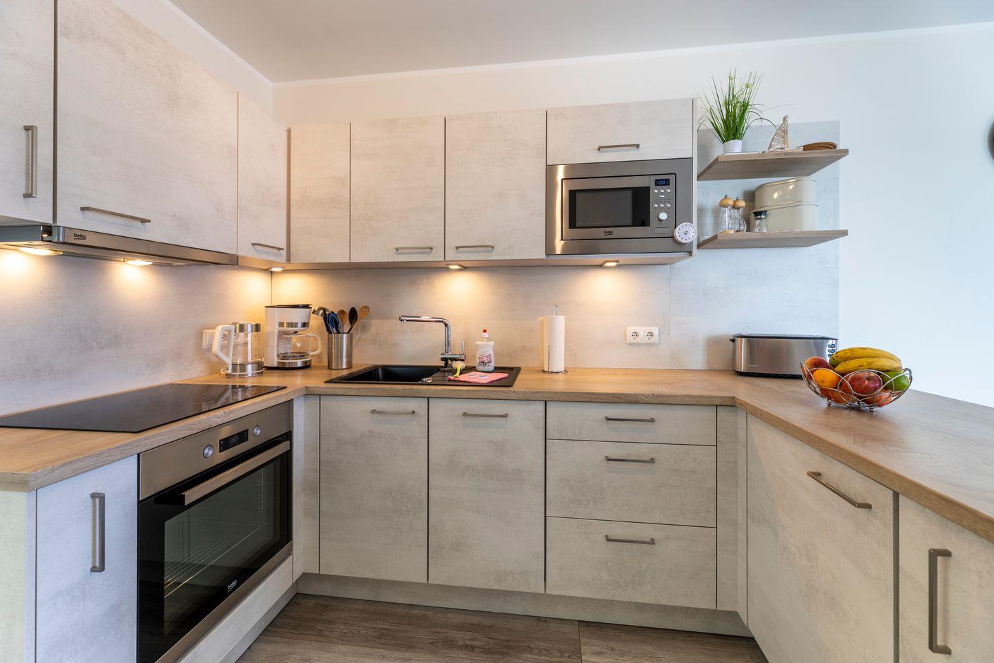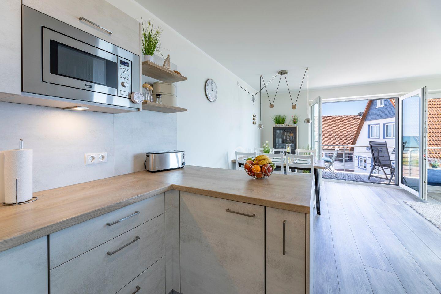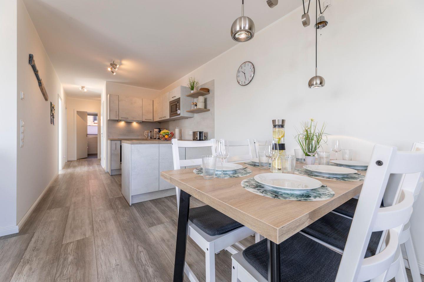 Am Esstisch können alle Gäste der Unterkunft zu gemeinsamen Mahlzeiten zusammenkommen. Direkt angrenzend befindet sich die offene Küche in modernem Design. Diese ist vollumfänglich ausgestattet und verfügt neben einem Geschirrspüler auch über einen Induktions- Herd mit Backofen, eine Mikrowelle, Kaffeemaschine, Wasserkocher, Toaster, einen Kühlschrank mit Gefriermöglichkeit, und zahlreiche weitere Vorzüge.