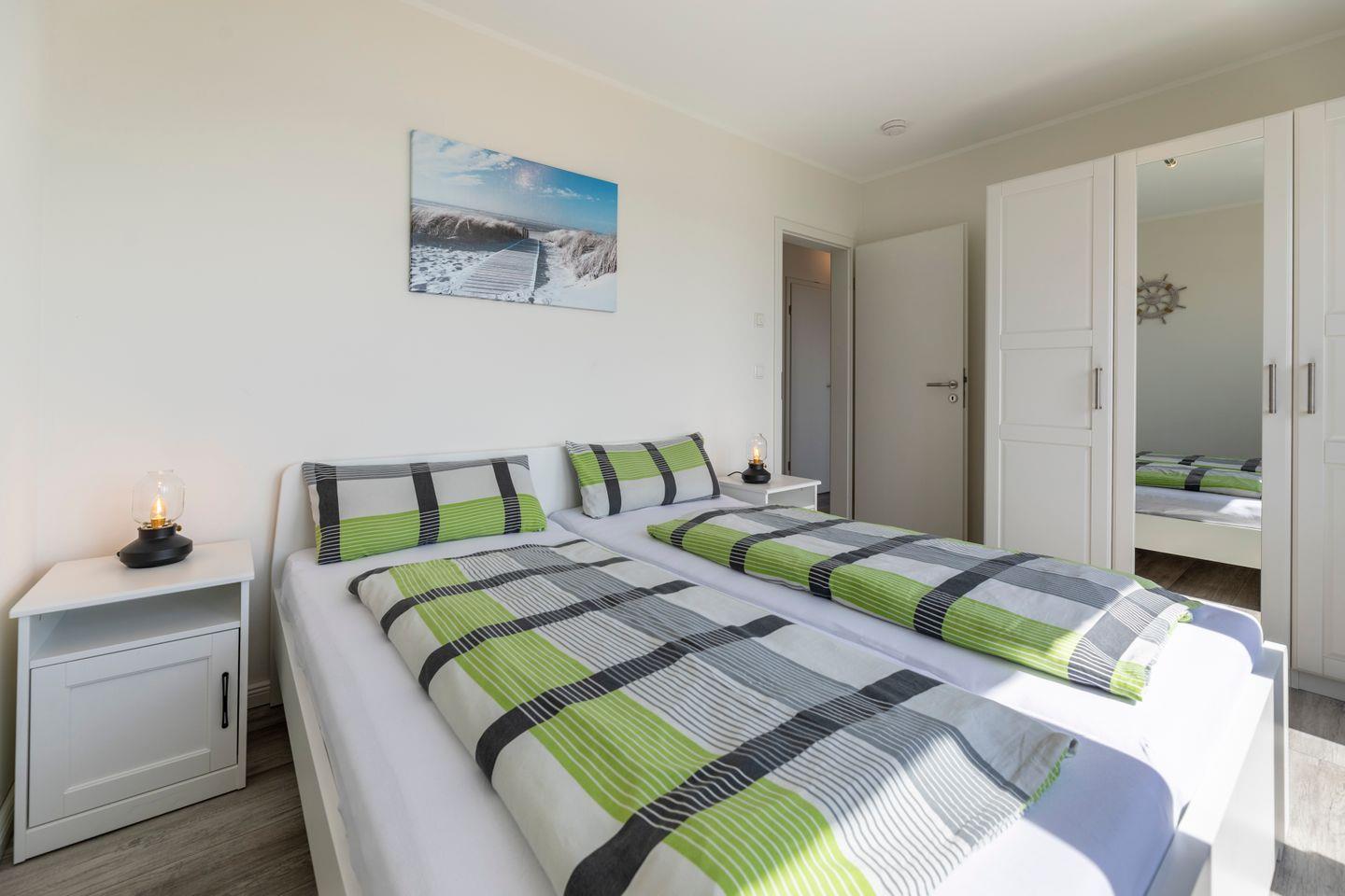 Das zweite Schlafzimmer verfügt über ein Doppelbett und ebenfalls über zusätzliche Staumöglichkeiten in Form eines Kleiderschranks.
