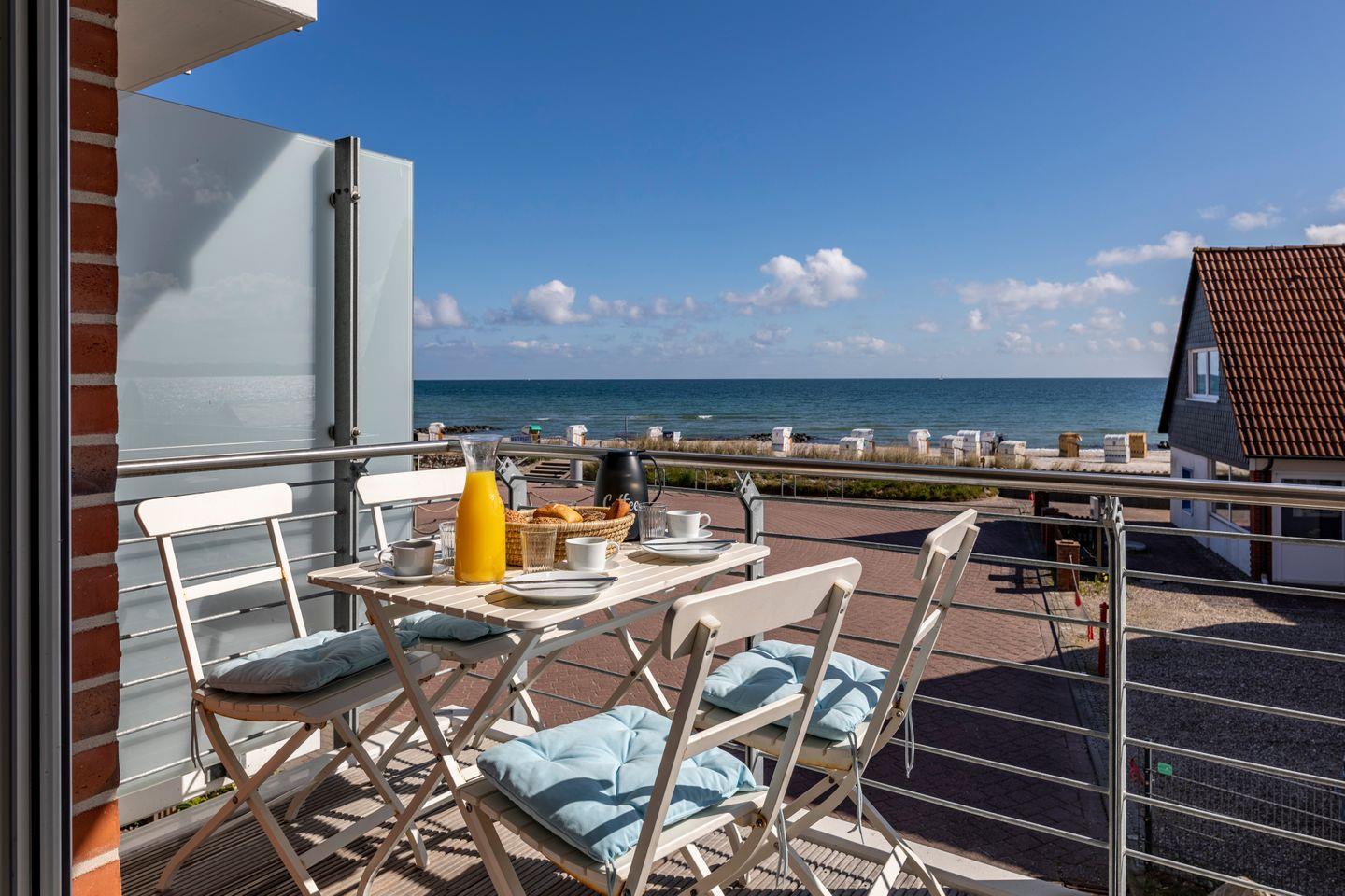 Zur Wohnung gehört ein nach Osten ausgerichteter Balkon mit herrlichem Blick auf die Ostsee und ihre wunderschönen Sonnenaufgänge. Hier stehen Tisch und Stühle bereit, um die Zeit im Freien genießen zu können.