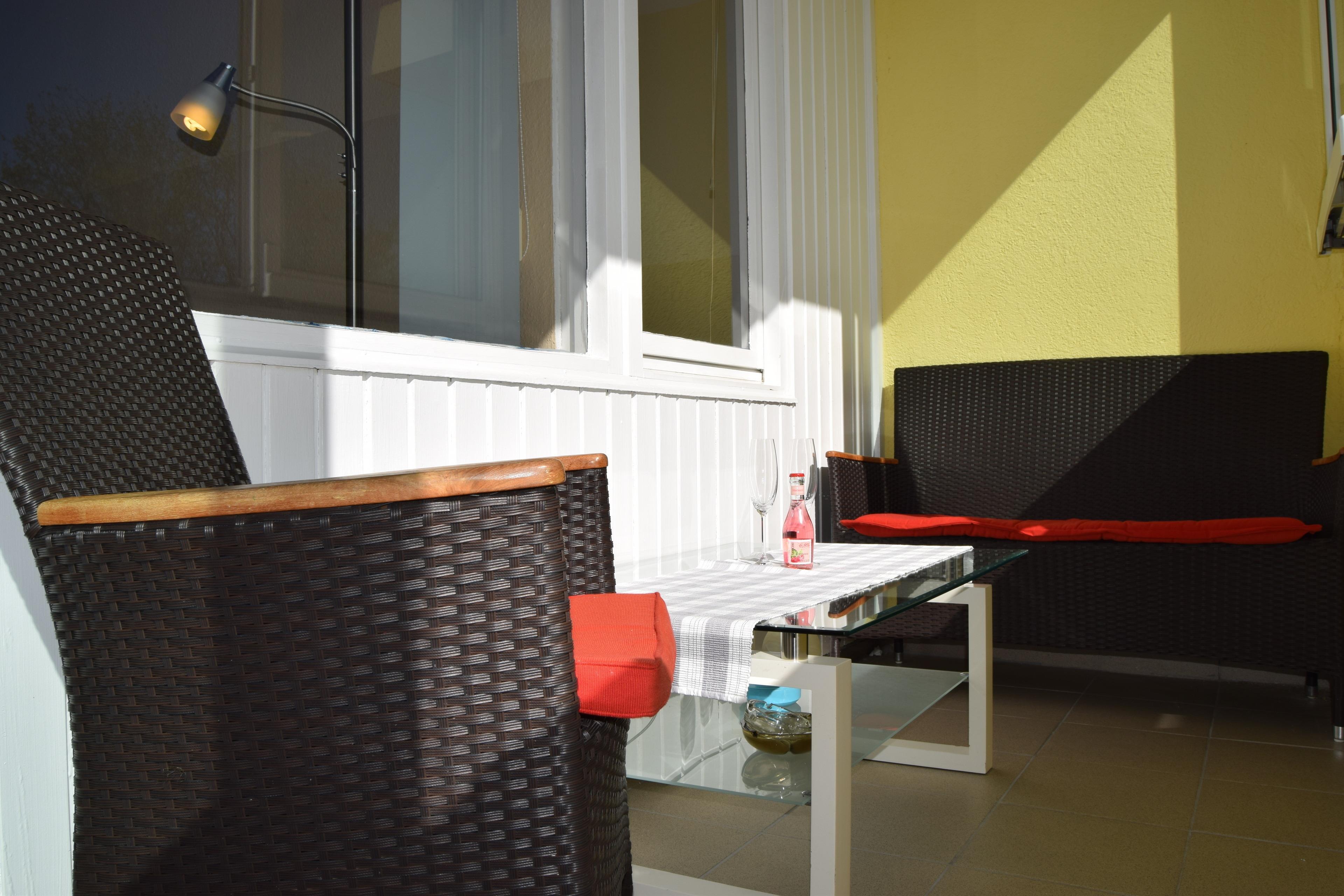 Balkonmöbel sind auf der geräumigen, nach Osten ausgerichteten, Loggia vorhanden. Die Loggia ist komplett verglast, so dass Sie bei jedem Wetter den Balkon nutzen können. Wenn Sie die Luft pur genießen möchten, schieben Sie einfach zwei der vier großen Fensterelemente zur Seite und haben einen offenen Balkon.