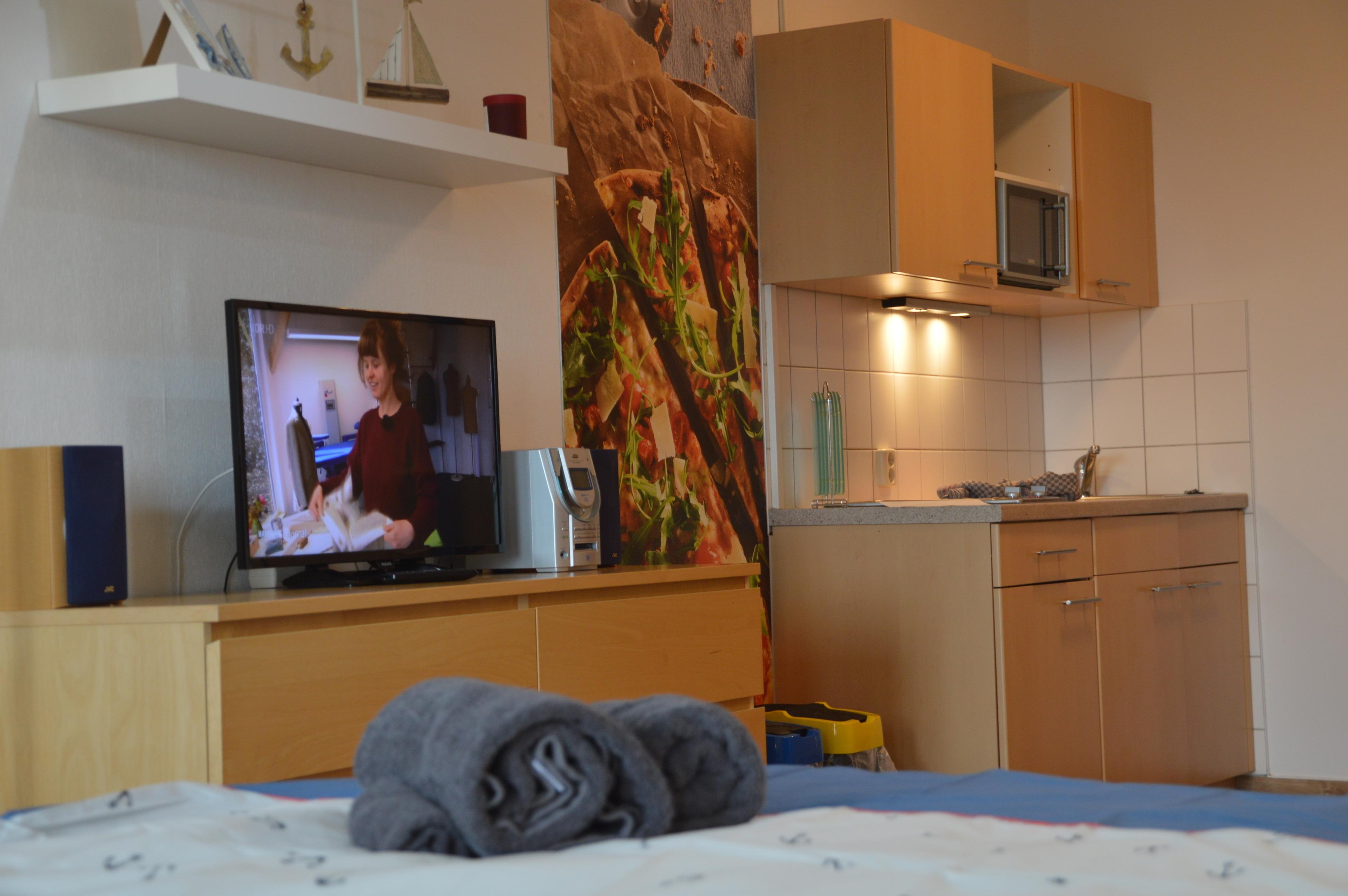 Unser 38 m² großes Appartement "Backbord" ist barrierearm mit dem Aufzug oder über das Treppenhaus zu erreichen. Es bietet einen gemütlichen Wohn und Schlafbereich mit TV und einem komfortablen Bett sowie einen bequemen Essbereich. WLAN ist hier selbstverständlich ebenfalls verfügbar. Ebenso gibt es einen Balkon mit herrlichem Blick über die Probstei, auf dem Sie die angenehme Brise der nur 700 Meter entfernten Ostsee genießen können. Hinter einer Trennwand stehen für die kleinen zwei Schlafplätze in einem Doppelstockbett zur Verfügung, sodass auch für sie der Aufenthalt zum Erlebnis wird. Eine Pantryküche bietet die Möglichkeit, sich selbst zu versorgen und das Badezimmer mit Dusche und WC rundet die Einrichtung ab. Im Flur direkt gegenüber liegt unser zweites Appartement "Steuerbord", das ebenfalls buchbar ist.