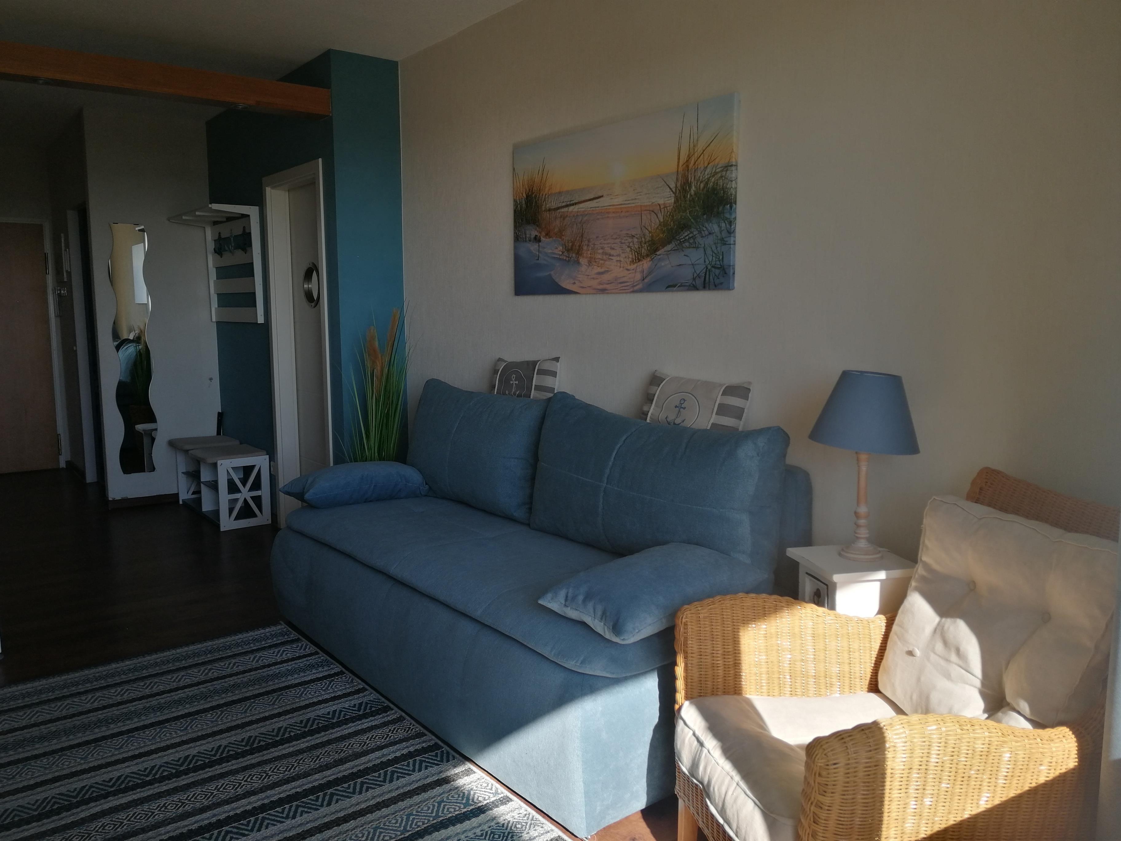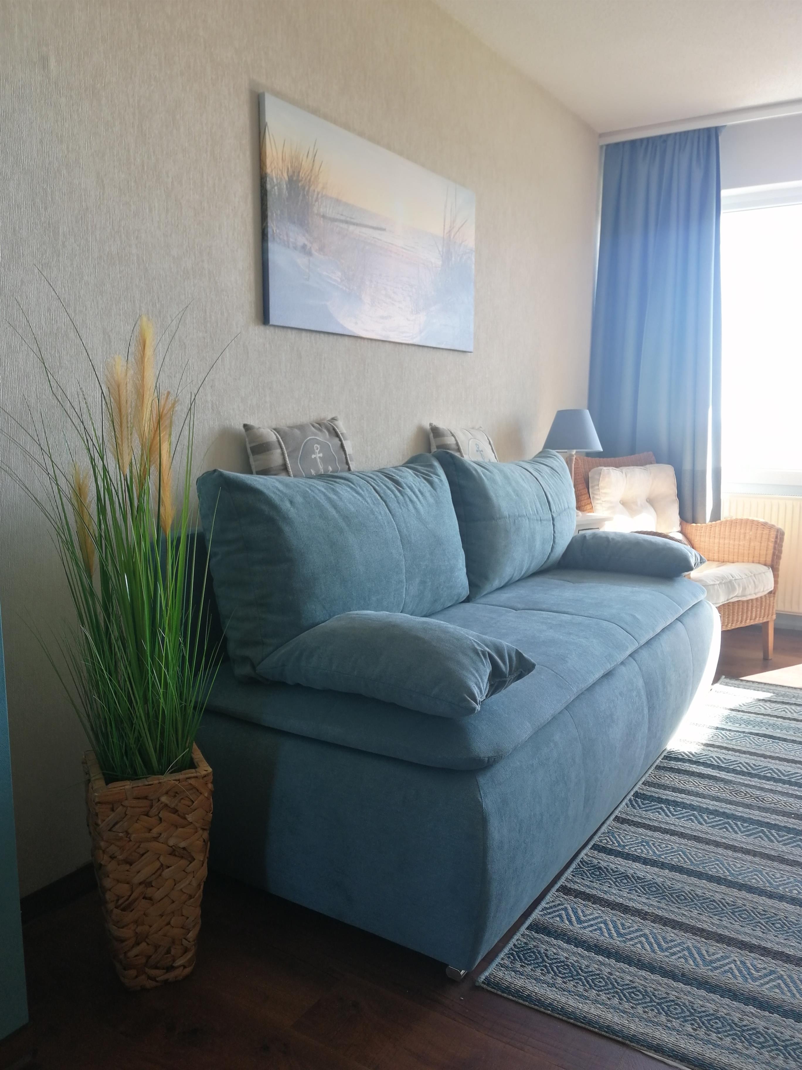 Im Wohnbereich befinden sich ein Sideboard mit Fernseher, DVD- Player, Radio mit CD-Player. Ein breites Sofa, das sich mit wenigen Handgriffen in eine bequeme 1,60 x 2,00 Meter große Schlafcouch verwandeln lässt.