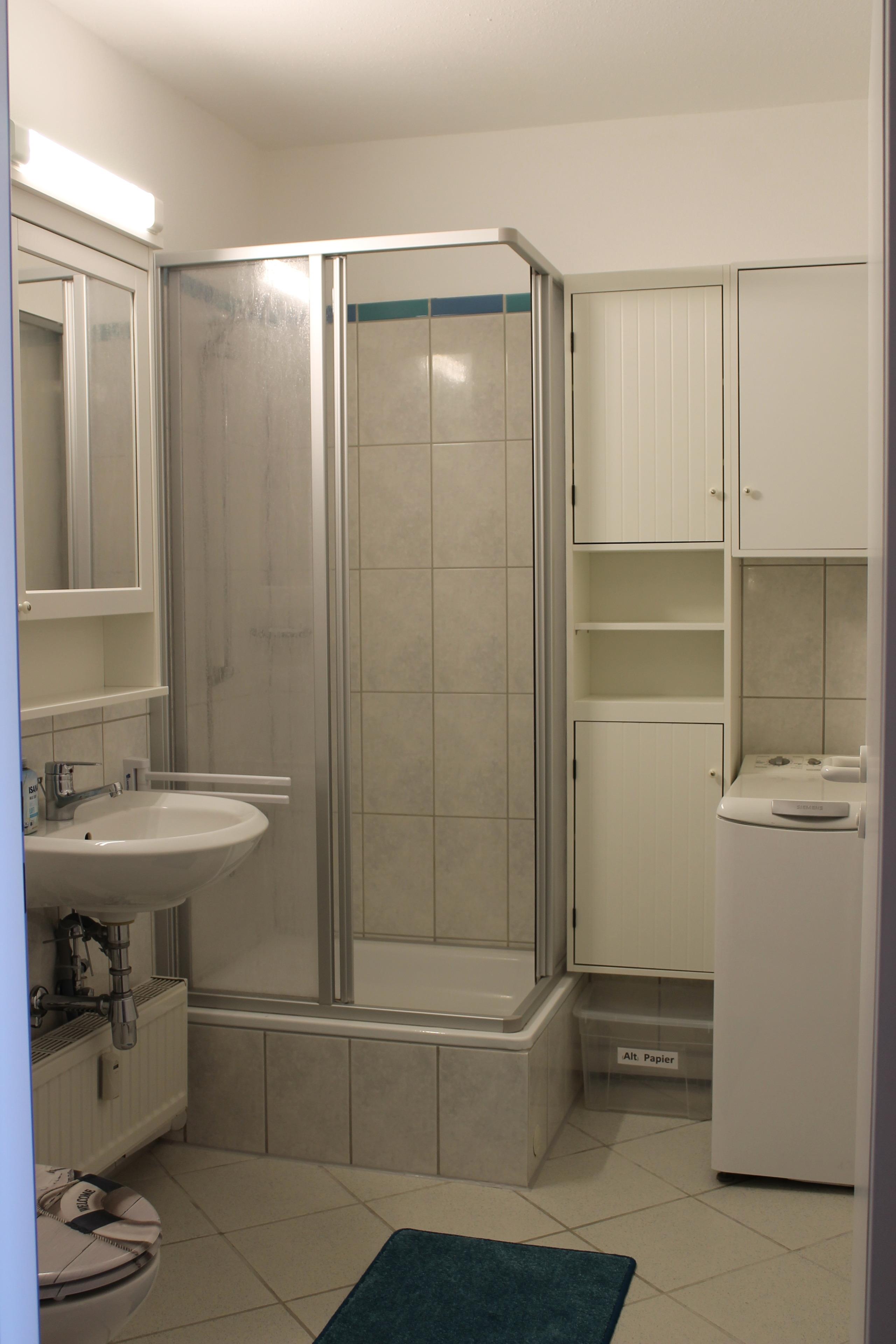 Im geräumigen Badezimmer mit Dusche und WC befinden sich ein Spiegelschrank mit Beleuchtung sowie ein weiterer Schrank und Waschmaschine.