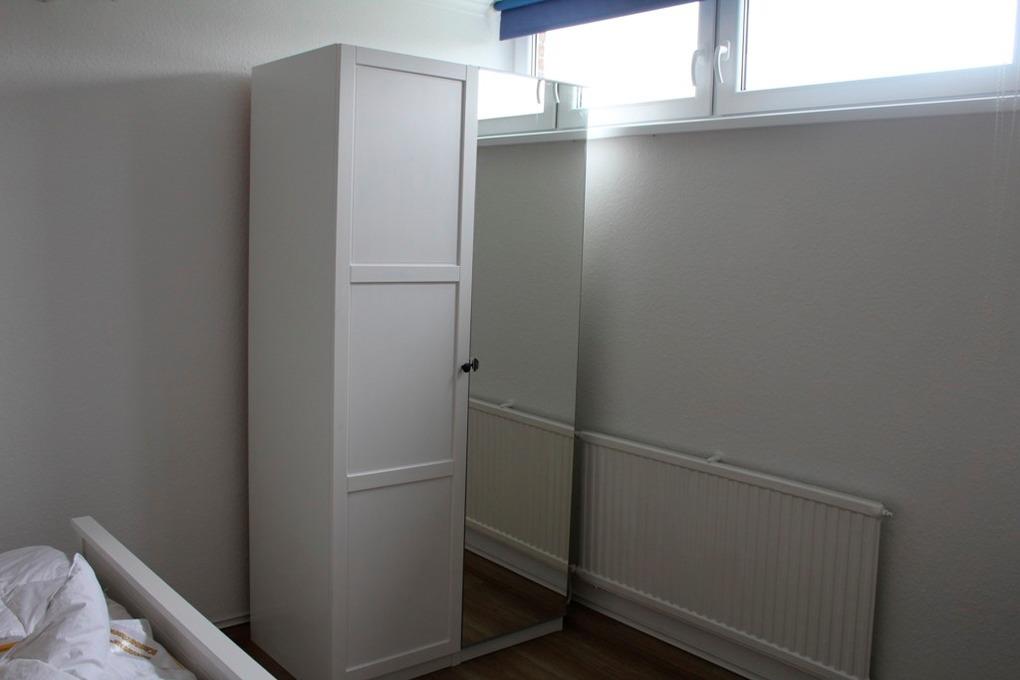 Das obere Stockwerk unterteilt sich - von einem Flur ausgehend - in zwei Schlafzimmer und in ein Badezimmer. Beide Schlafräume sind mit einem Doppelbett ausgestattet. In dem Kinderschlafzimmer steht ein 140 x 200 cm Bett. In dem Elternzimmer befinden sich ein 160 x 200 cm Bett, ein Kleiderschrank und eine Sitzecke. Zusätzlich könnte man ein Reisebettchen, was im Haus vorhanden ist, in dem Zimmer unterbringen. Eine Badewanne mit einer Duschfunktion, ein Waschbecken und ein WC bilden das Badezimmer.