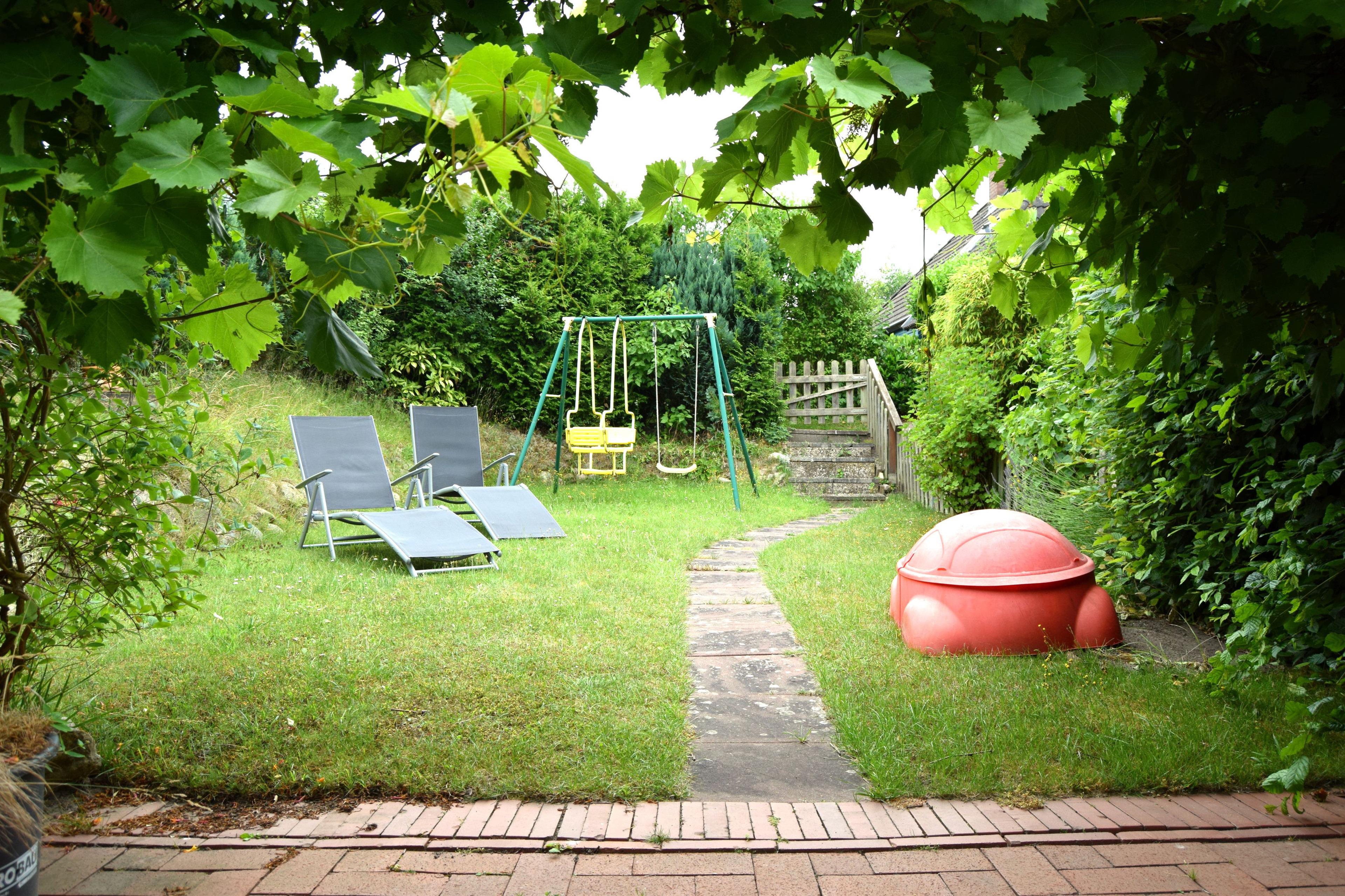Die Terrasse lädt zum Grillen, zum Spielen für die Kinder (Schaukel, Sandkiste) oder zum Lesen ein.