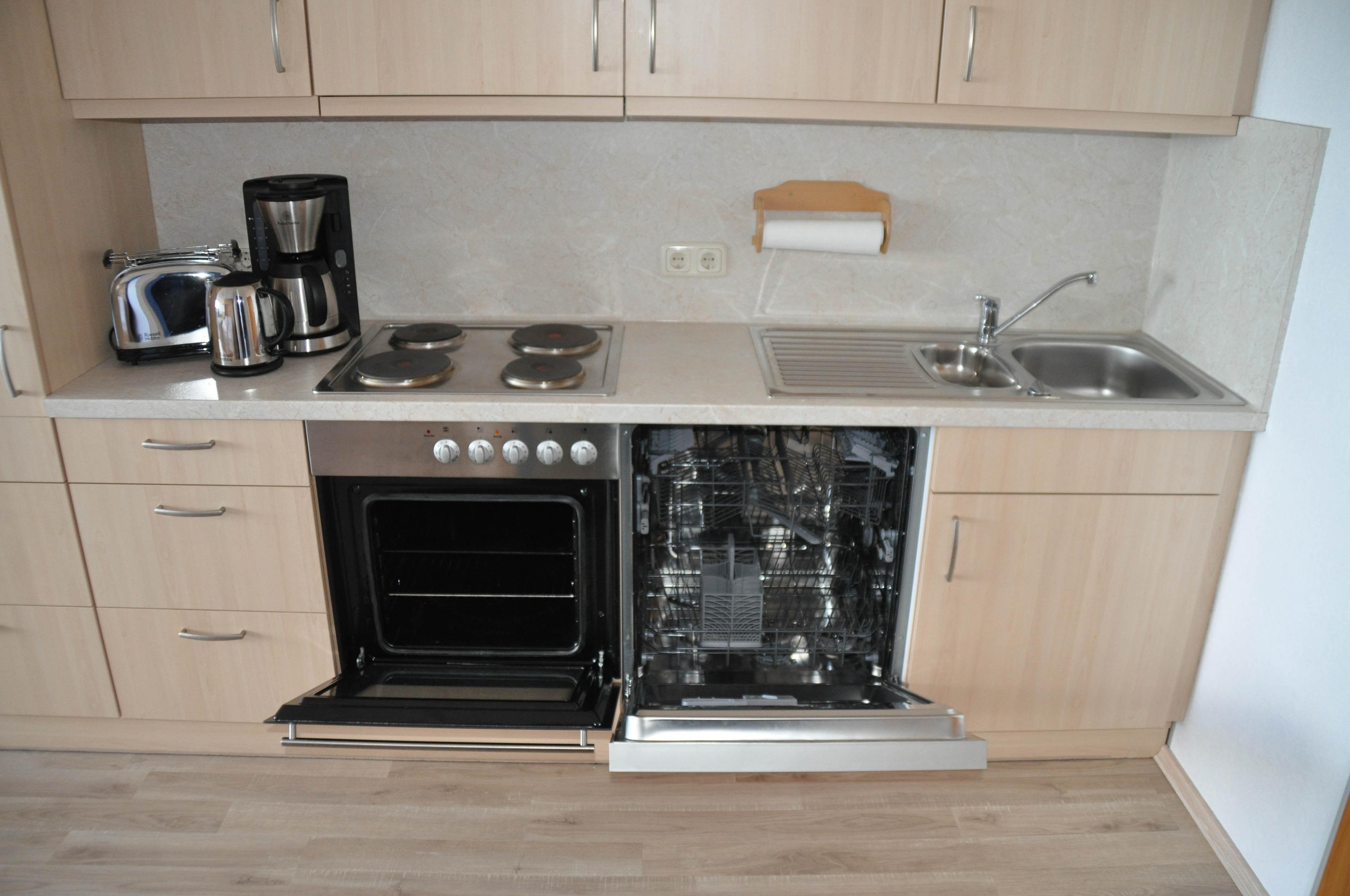 • Einbauküche mit Geschirrspülmaschine, Backofen und E-Herd mit 4 Kochplatten