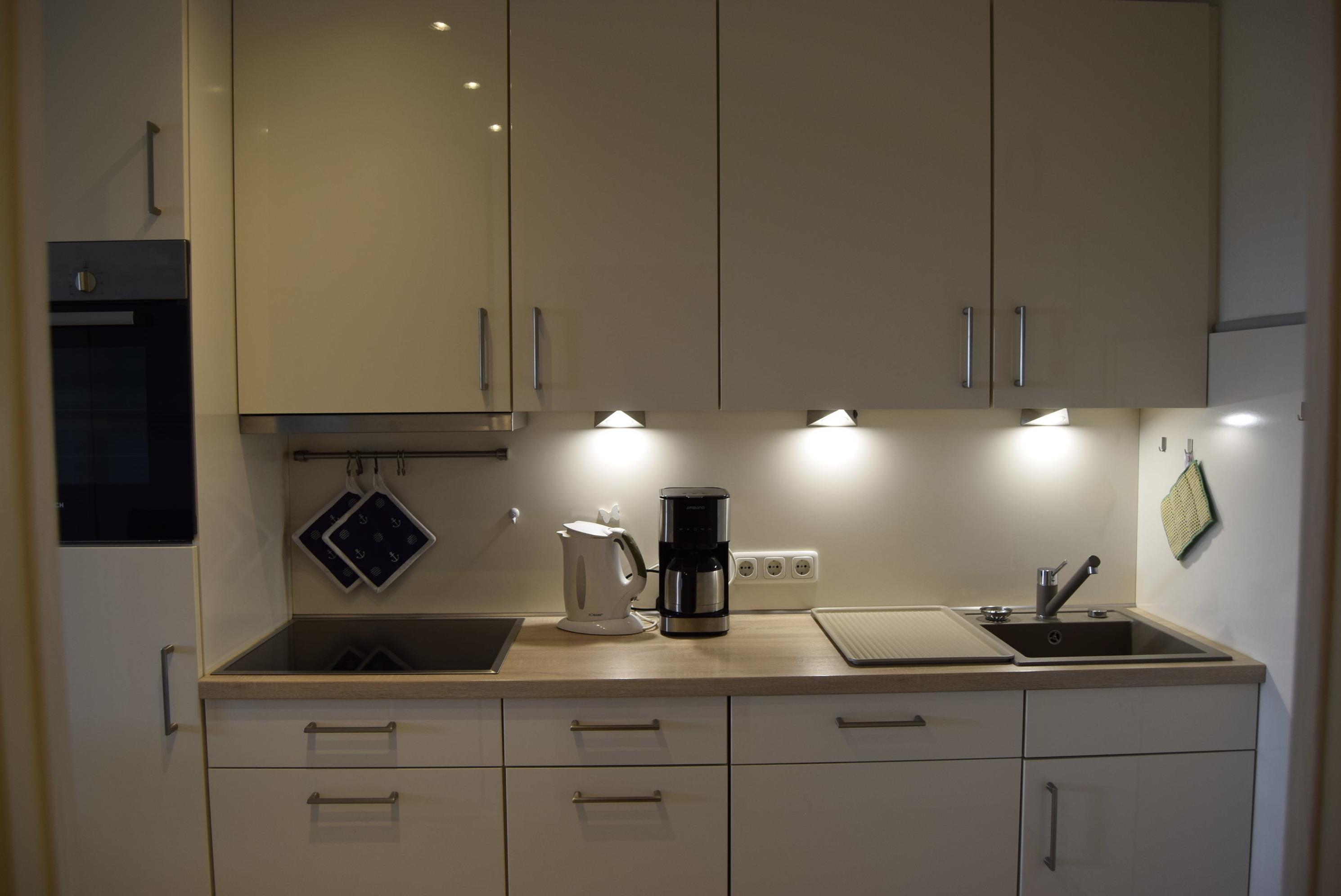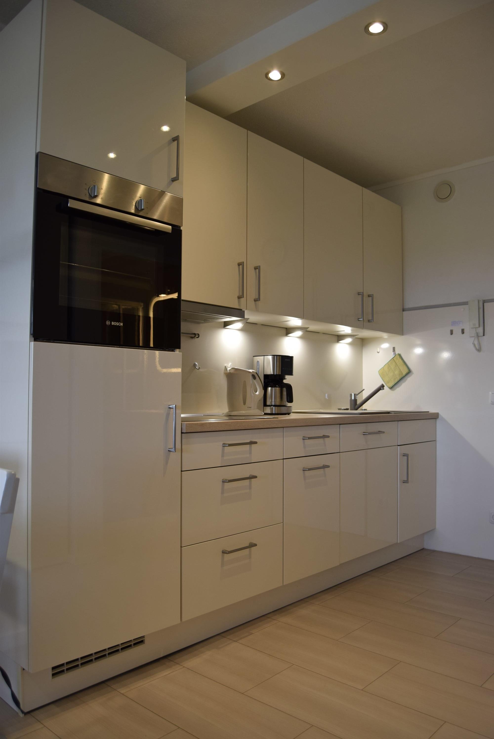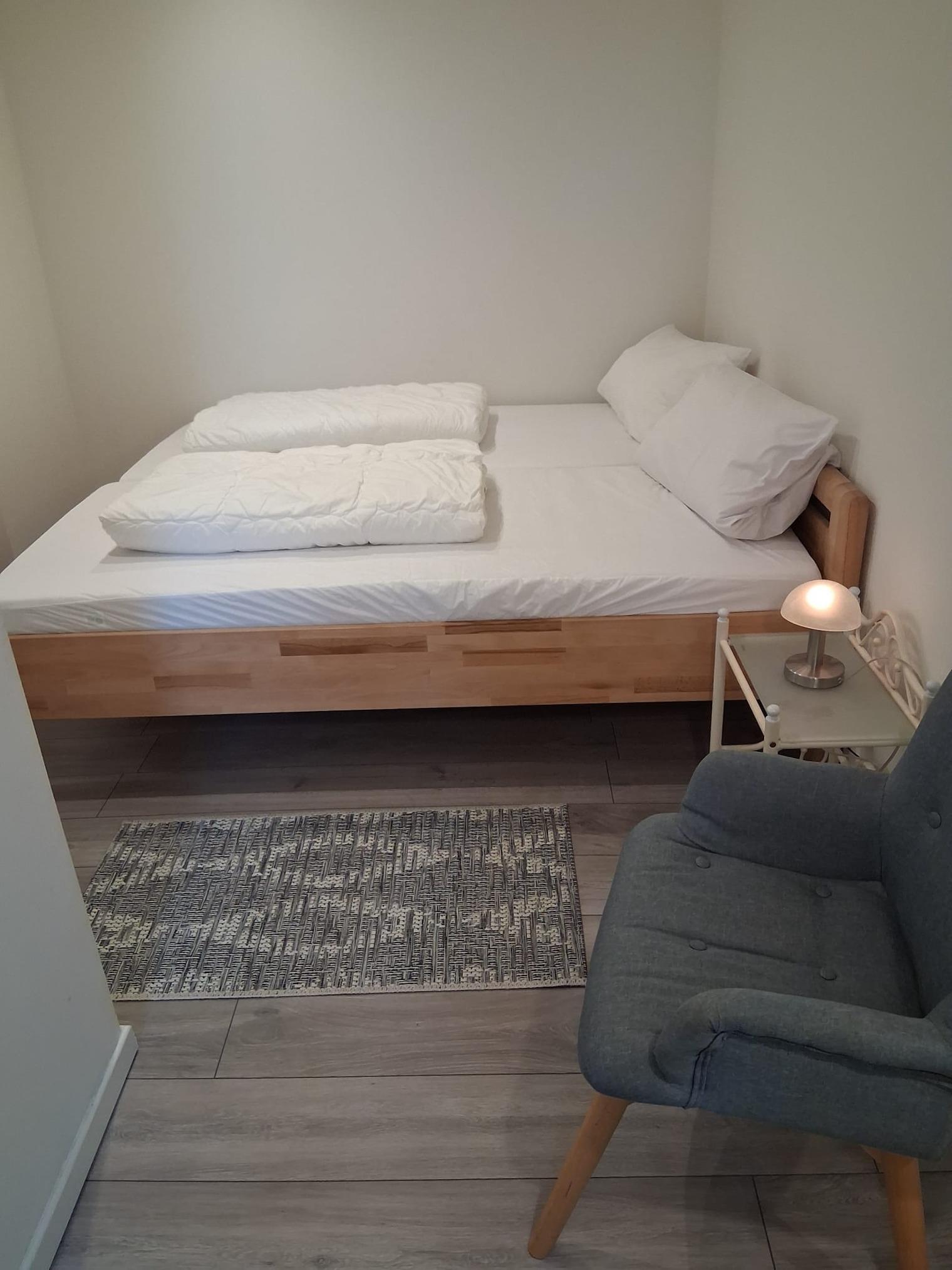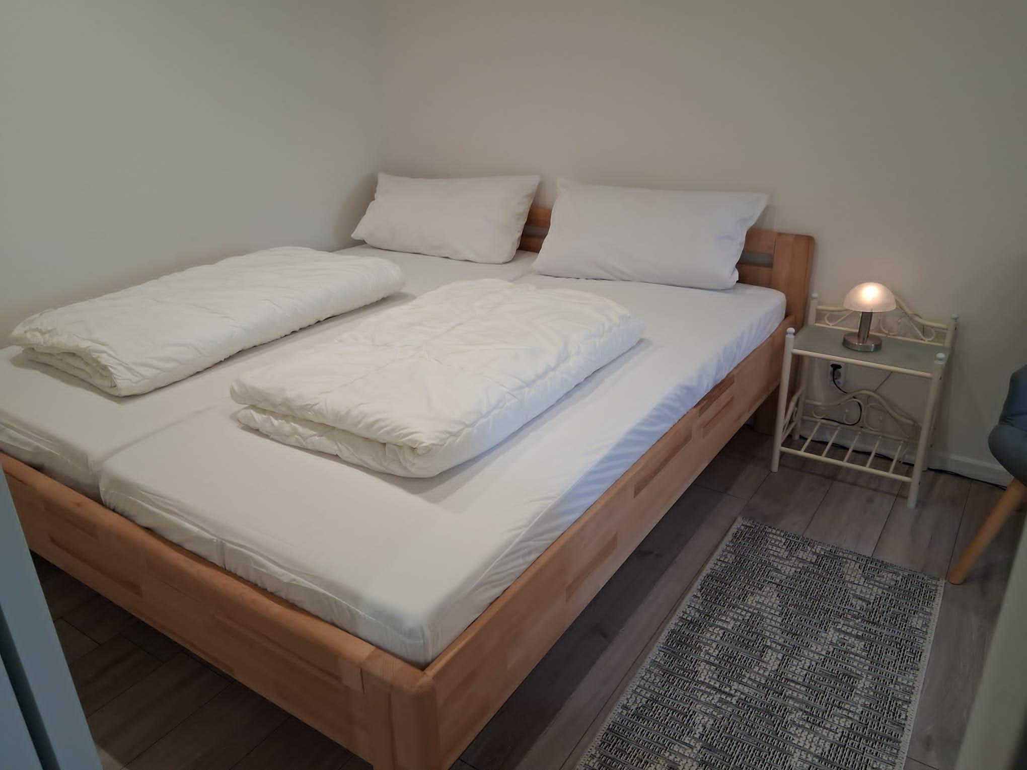 Im Zentrum der Wohnung befindet sich das Wohnzimmer mit gemütlicher Schlafcouch (2,00 m x 2,00 m) und Esstisch. Daran angeschlossen ist die voll ausgestattete Küchenzeile. Kaffeemaschine, Toaster, Wasserkocher, sowie ein 4-Platten Herd, Backofen und eine Spülmaschine lassen keine Wünsche offen. Im Schlafzimmer steht Ihnen ein Doppelbett (1,80 x 2,00 m) mit je einer Matratze 0,90 x 2,00 m und natürlich ein Kleiderschrank zur Verfügung.