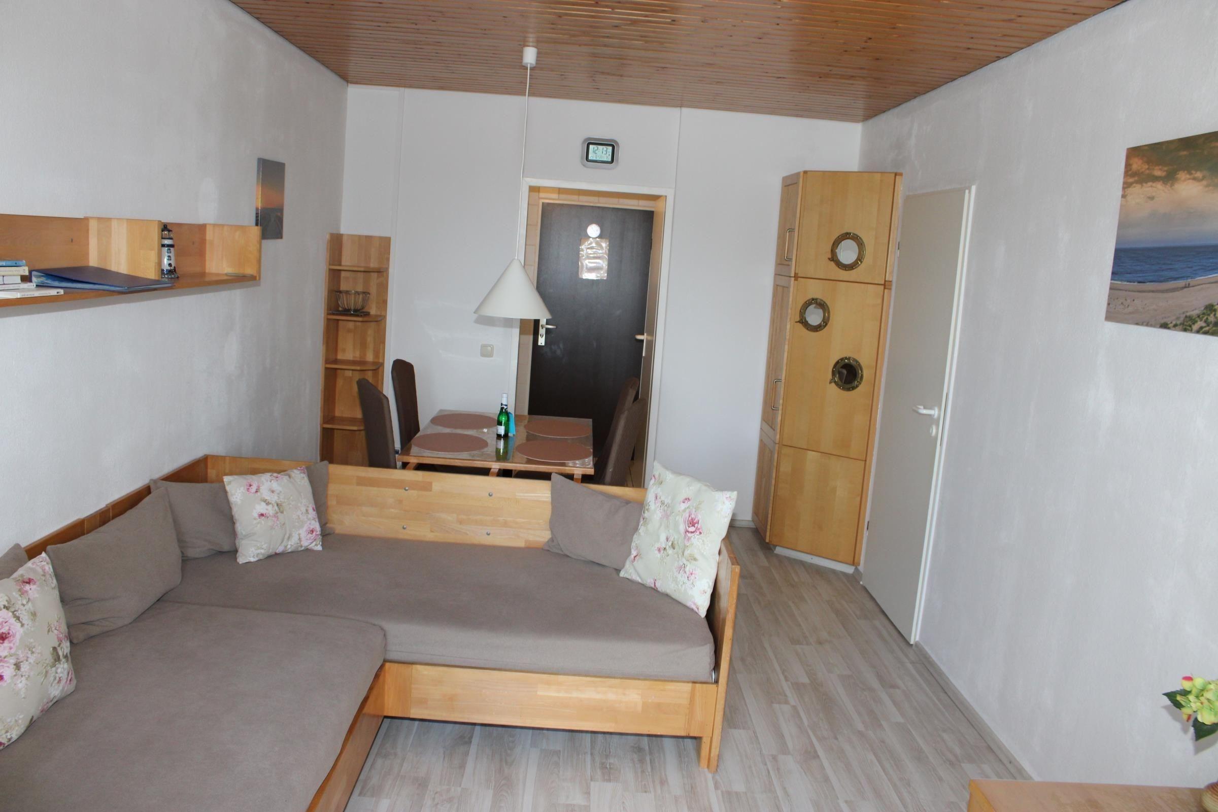 Zwei Schlafsofas bilden die Sitzecke dieser Ferienwohnung im Wohn-Schlafraum. Die Sofas können mit wenigen Handgriffen zu weiteren, bequemen Schlafplätzen umgebaut werden. Im separaten Schlafraum stehen zwei Einzelbetten und ein Kleiderschrank.