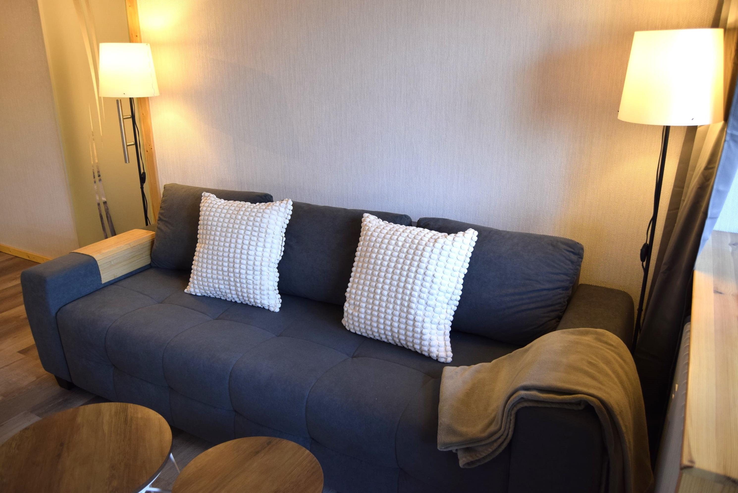Hier erwartet Sie eine breite, ausziehbare Schlafcouch (140cm x 190cm) , ideal für gemütliche Stunden, sowie eine Loggia, die abends zu ruhigen Momenten im Grünen einlädt – perfekt für ein gutes Buch oder einfach zum Genießen der Natur.