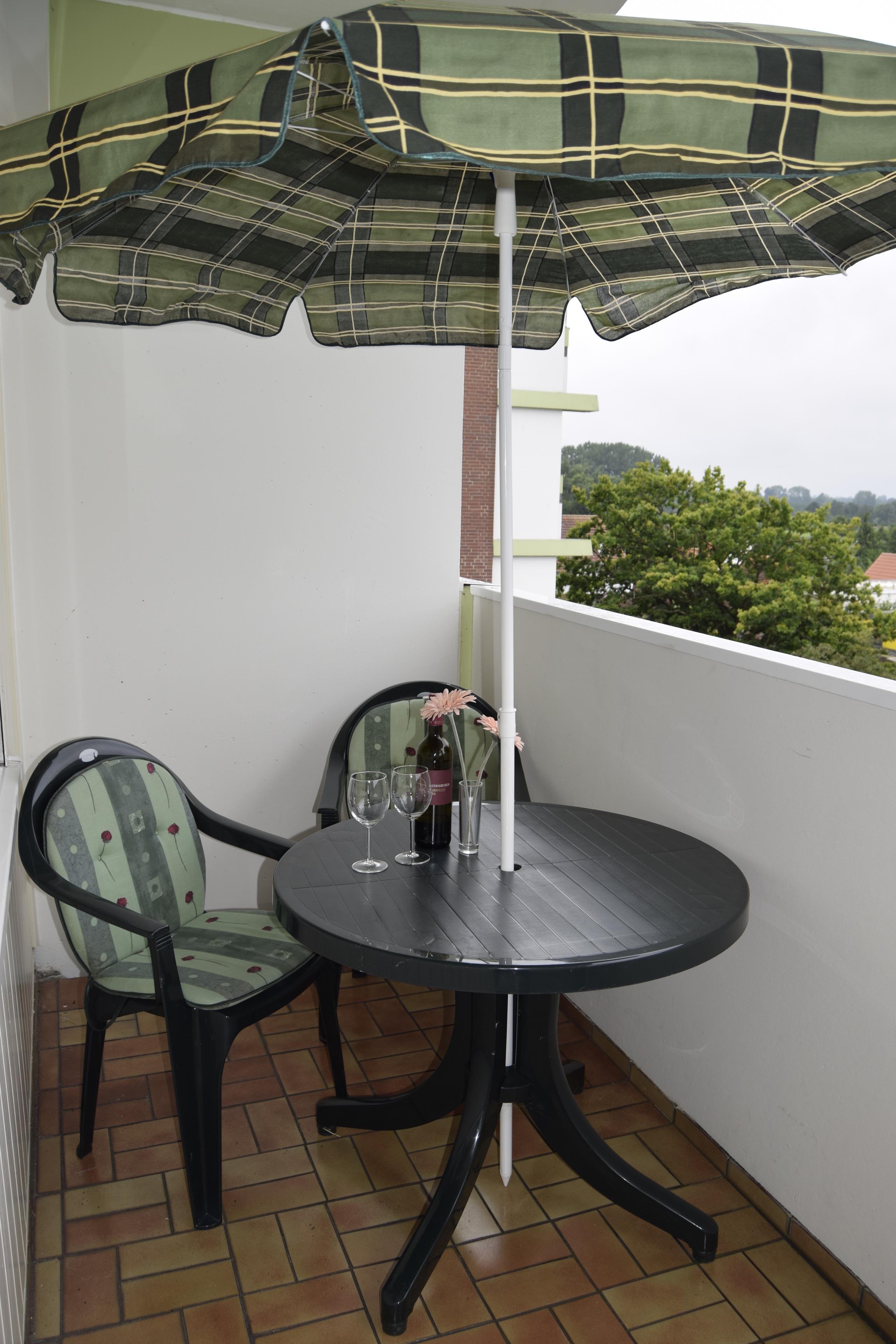 Der überdachte Balkon ist zur Westseite ausgerichtet und ein großer Sonnenschirm ermöglicht einen Platz im Schatten.