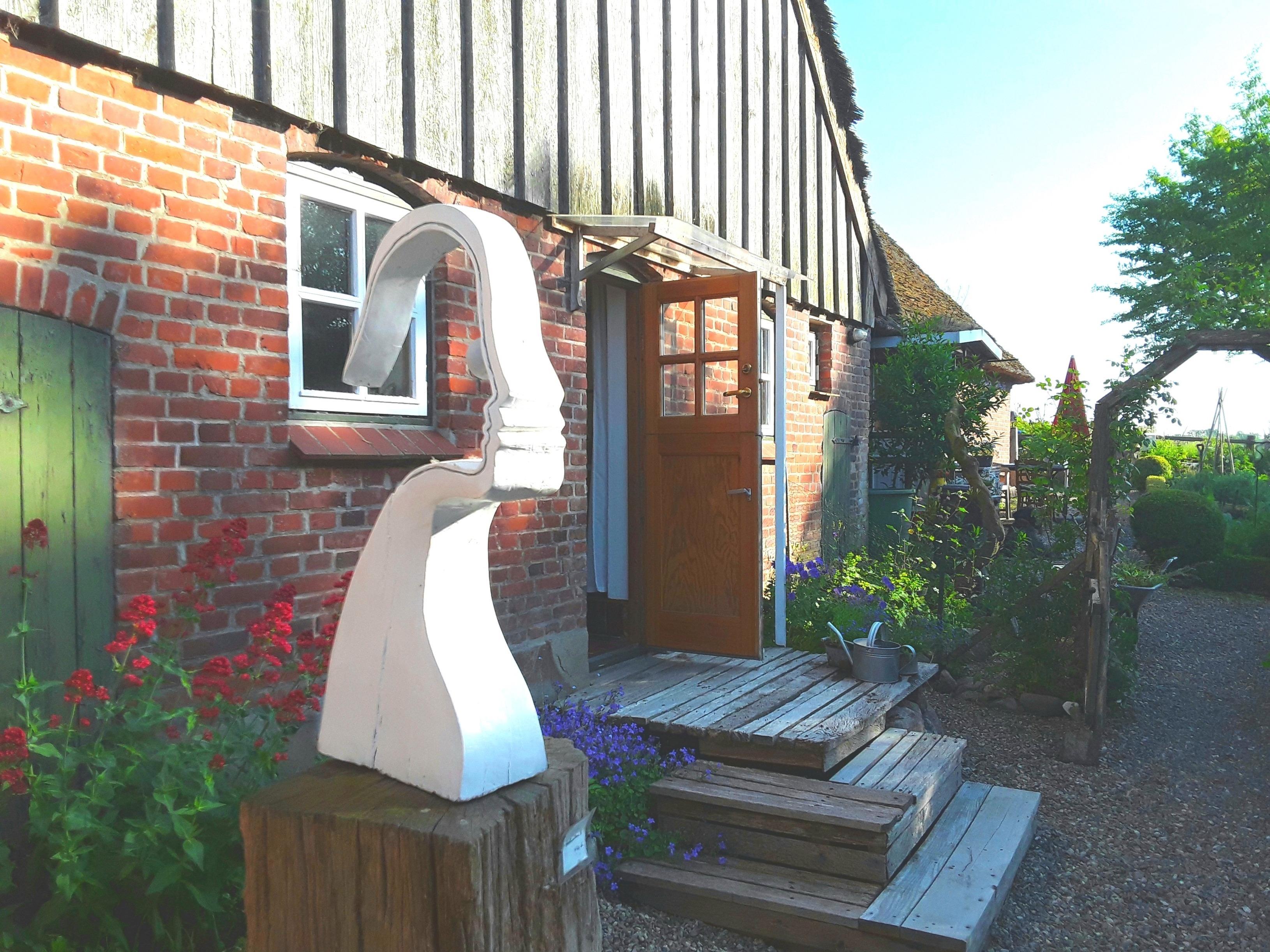 Abschalten auf einem ca. 250 Jahre alten reetgedeckten Resthof in einsamer Lage. Bei uns finden Sie einen Obst- und Gemüsegarten, einen Skulpturengarten und eine Bildhauerwerkstatt.
