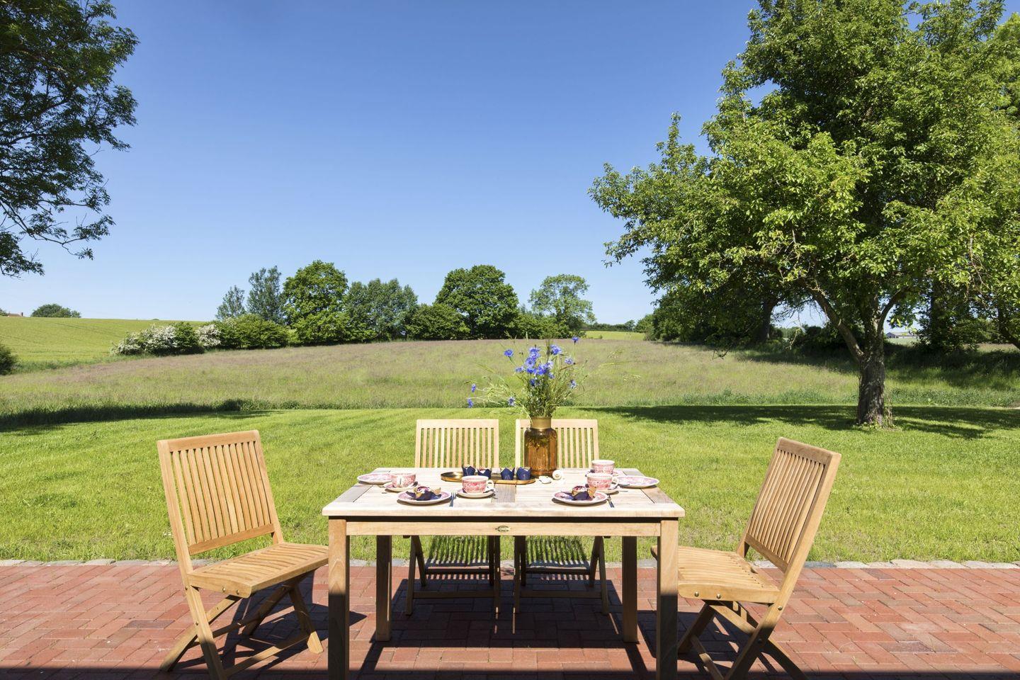 Von der Terrasse aus hat man einen traumhaften Blick über die angrenzende Koppel und dem zum Haus gehörenden, eingezäunten Teich. Der Strand von Waabs liegt etwa fünf Kilometer entfernt und ist mit dem Fahrrad in ca. 15 Minuten zu erreichen. Für moderne Standards sorgen Fernseher, Stereoanlage, eine gut ausgestattete Küche und WLAN (Glasfaseranschluss).