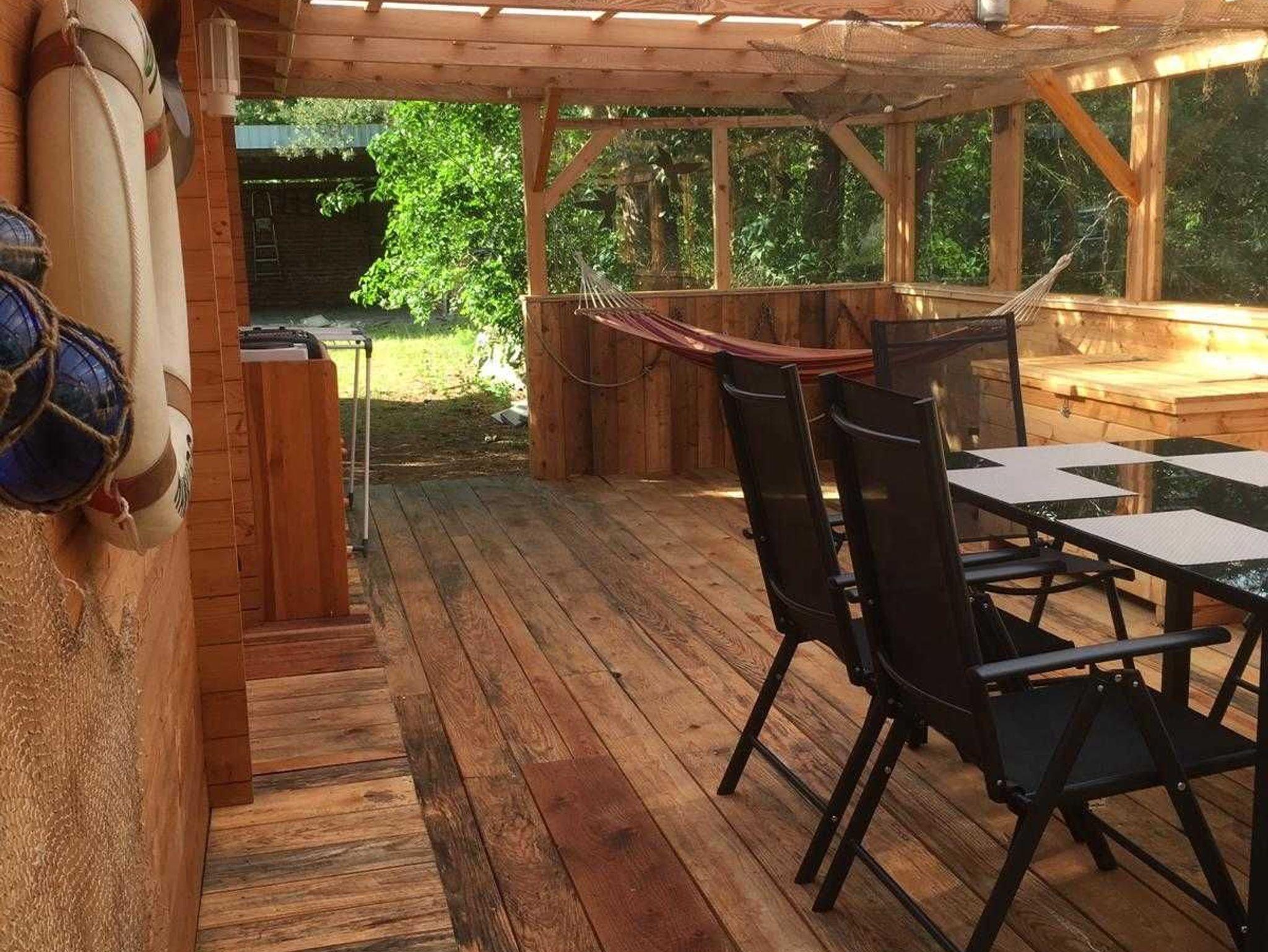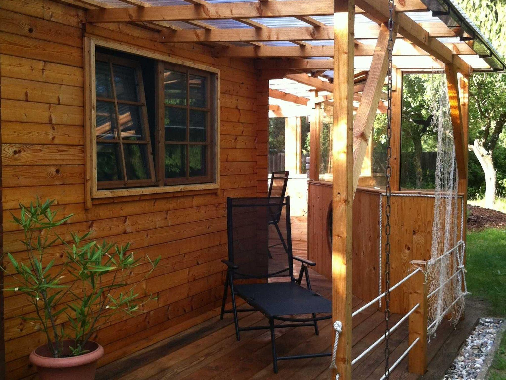 Terrasse überdacht mit Sitzecke und Sonnenliege, Elektrogrill und Hängematte, Wäscheständer