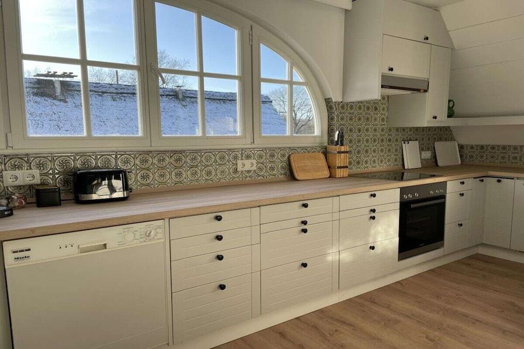 In der Holsteinischen Schweiz & Naturschutzgebiet Mittlerer Stocksee, fußläufig zum See, befindet sich das weitläufige Anwesen in Alleinlage; mit einer Reet gedeckten Remise, eingerichtet als großzügige Ferienwohnung ( ca. 90m² ) für 2-4 Naturliebhaber. Neu renoviert, im Landhaus-Stil eingerichtet, wird sie seit 2023 erstmals als Feriendomizil angeboten. Das Schlafzimmer ist mit einem großen Fenster sehr freundlich und gemütlich. Auf der gegenüberliegenden Seite liegt der begehbare Kleiderschrank mit großzügigem Stauraum. Im großen Loft-Wohnzimmer befindet sich ein Ausziehsofa und ein Esstisch für 4 Pers.. Die große Küche ist voll ausgestattet; es gibt ebenfalls ein Tisch für min. 2 Pers.. Das neue Badezimmer besitzt eine große Dusche und ist zusätzulich mit Waschmaschine ausgestattet. Vor dem Haus ist der Garten mit einem schönen, sonnigen Sitzplatz. Auf unserem Hof befindet sich eine kleine private Reitanlage.