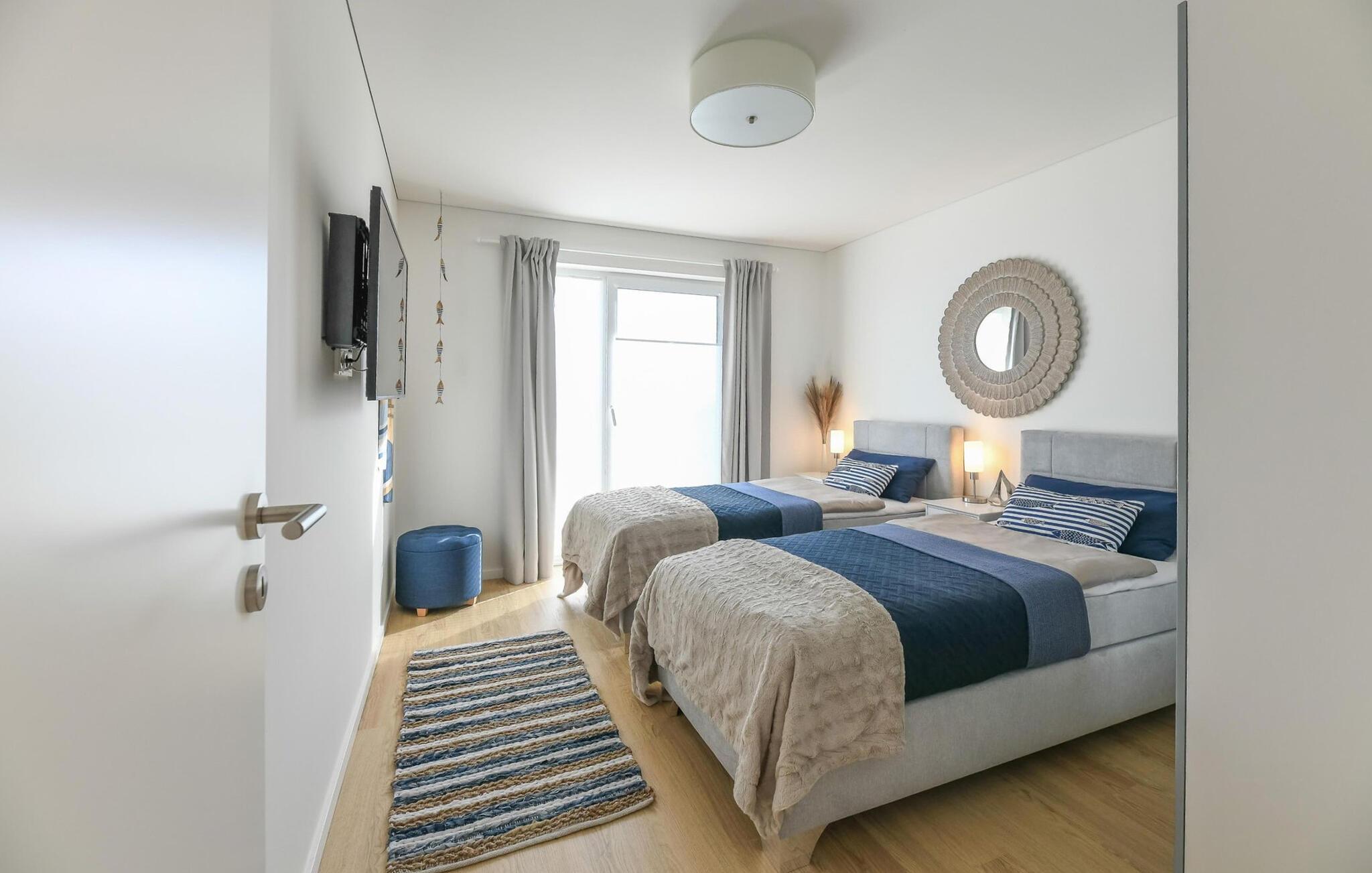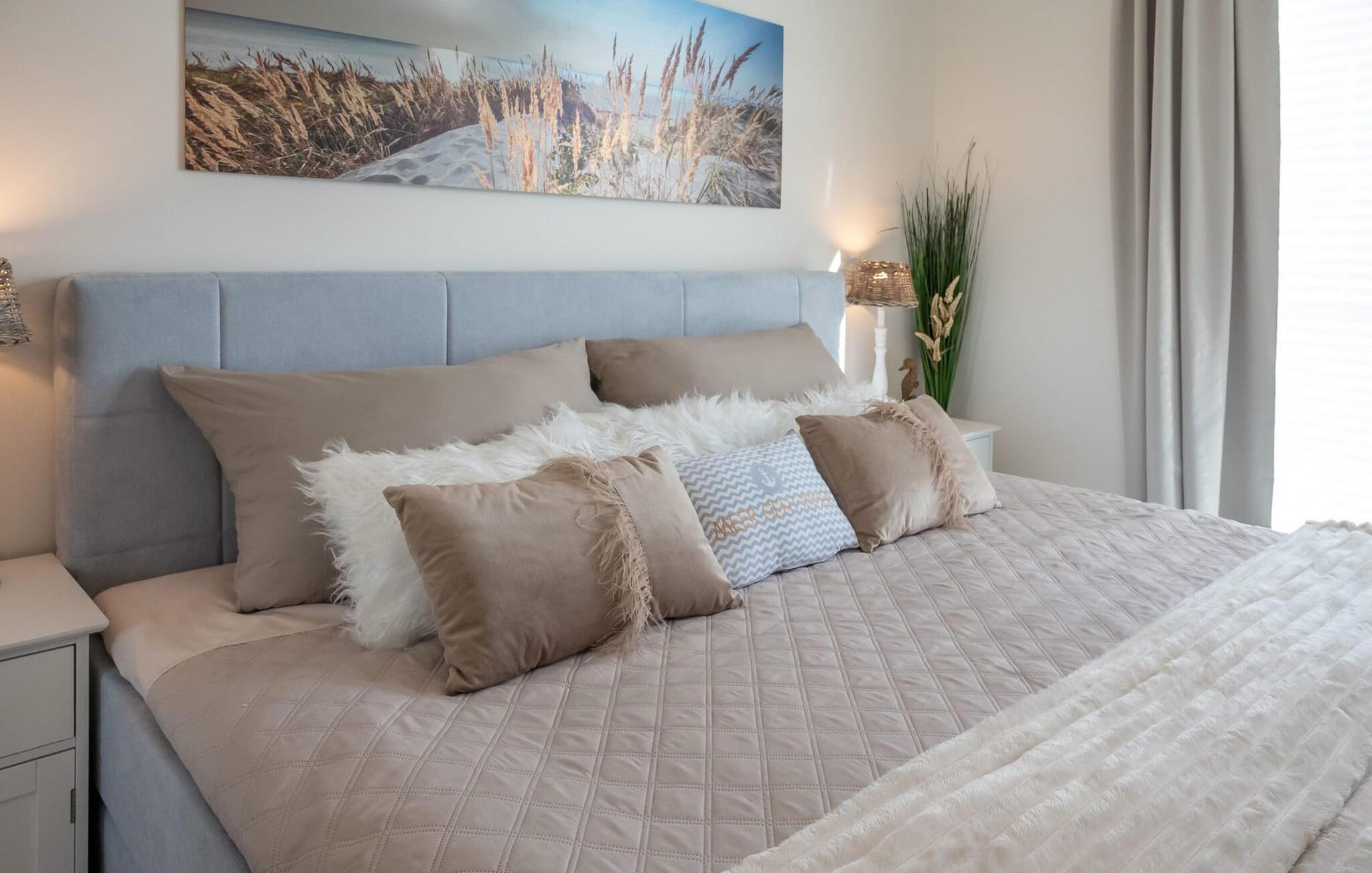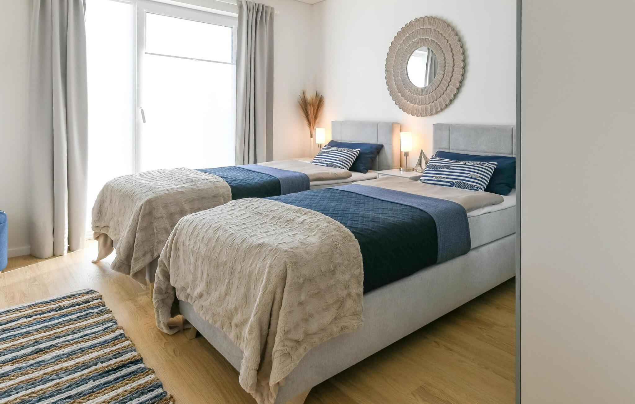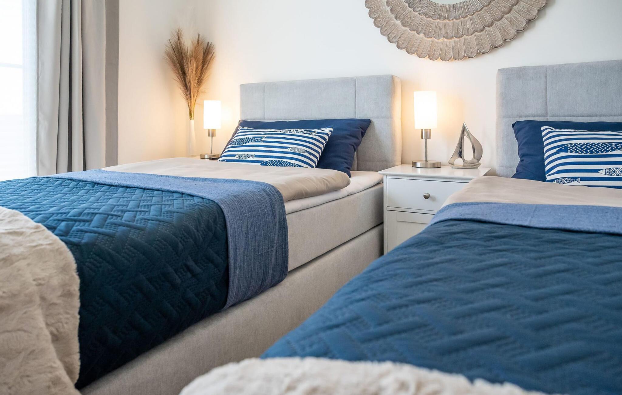 Für die nächtliche Erholung stehen zwei Schlafzimmer bereit. Ein Schlafzimmer ist mit einem Doppel-Boxspringbett ausgestattet, während das zweite Schlafzimmer über zwei Einzel-Boxspringbetten verfügt.