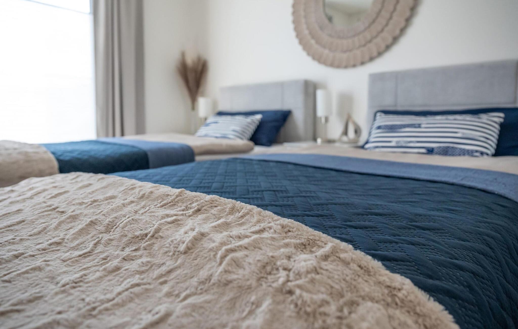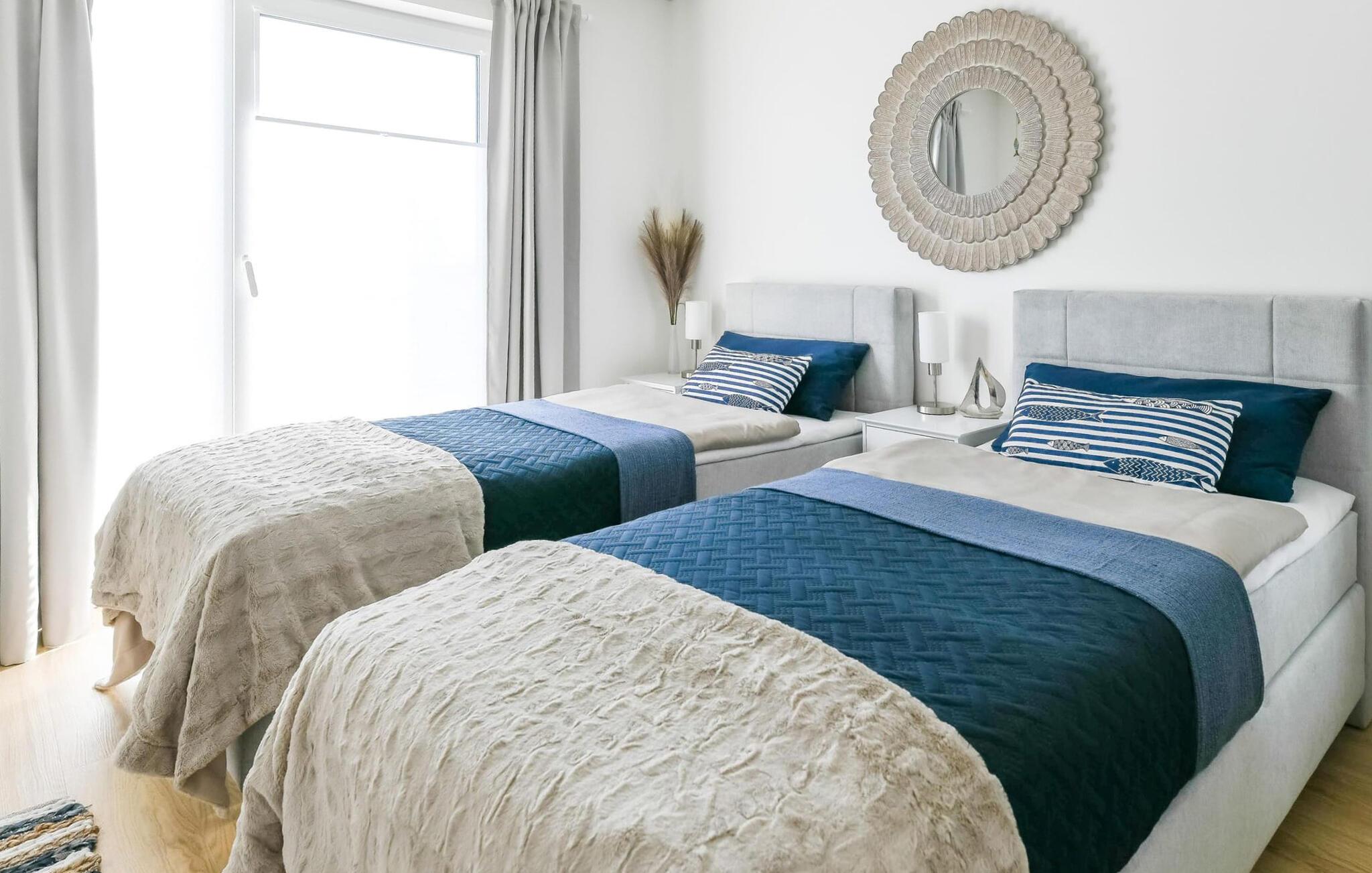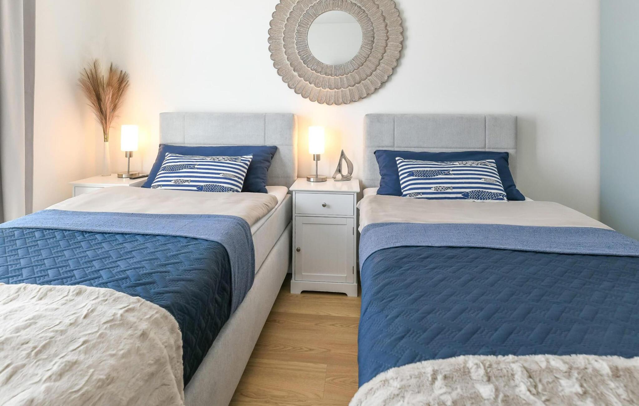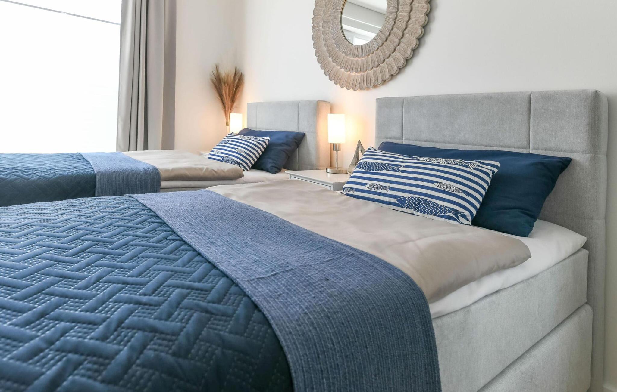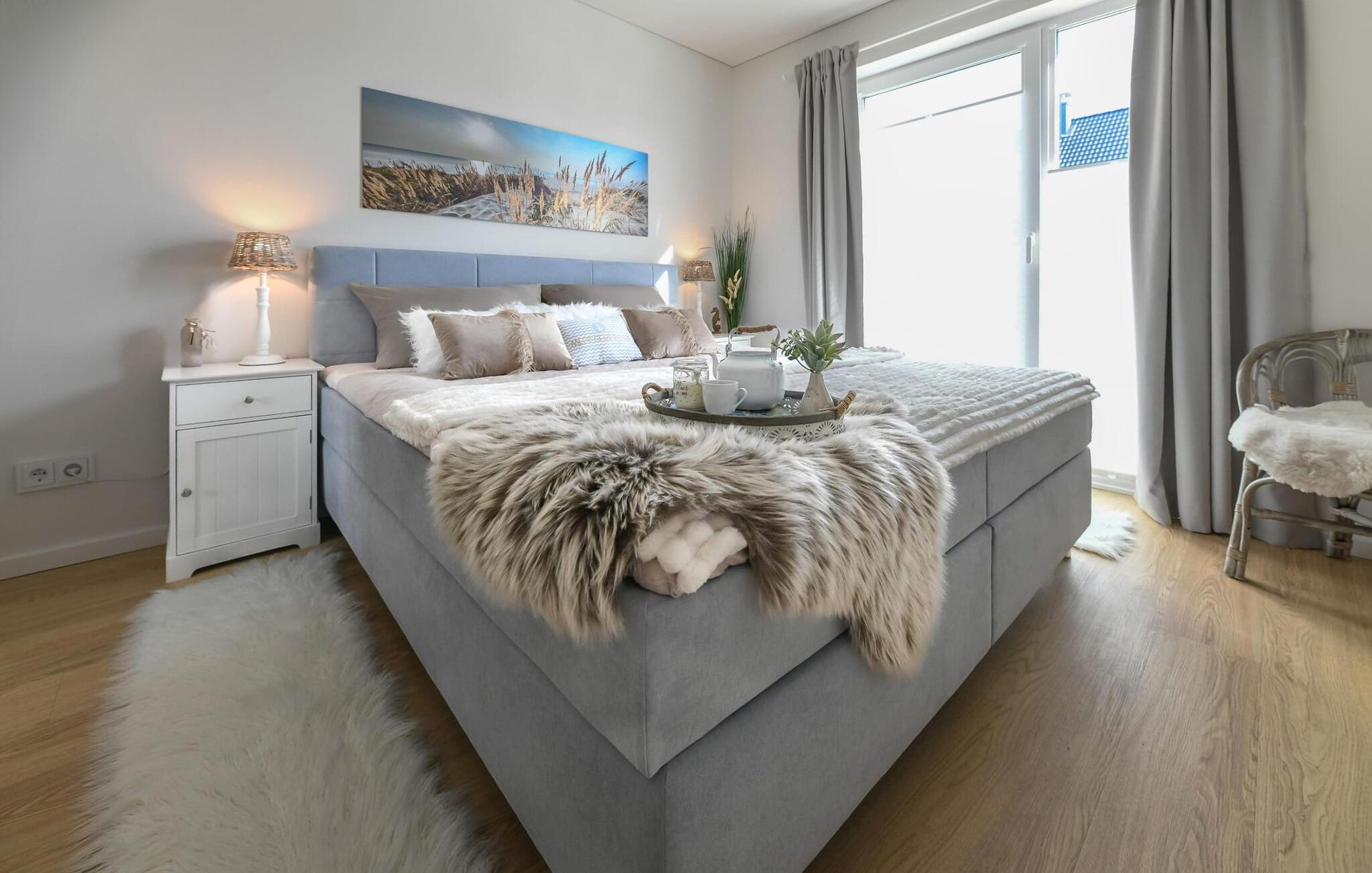 Für die nächtliche Erholung stehen zwei Schlafzimmer bereit. Ein Schlafzimmer ist mit einem Doppel-Boxspringbett ausgestattet, während das zweite Schlafzimmer über zwei Einzel-Boxspringbetten verfügt.