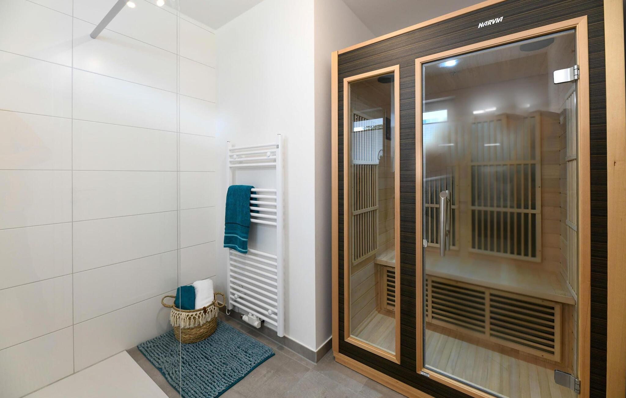 Nach einem trubeligen Urlaubstag könnt ihr im Bad mit hochwertiger, bodengleicher Dusche und einer Infrarot-Sauna Wellnessmomente genießen. Schöner kann ein Urlaubstag nicht enden.