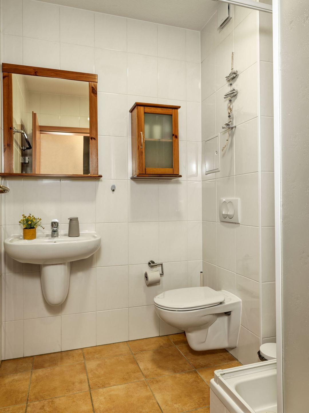 Das Bad verfügt über WC, Dusche und Waschbecken.