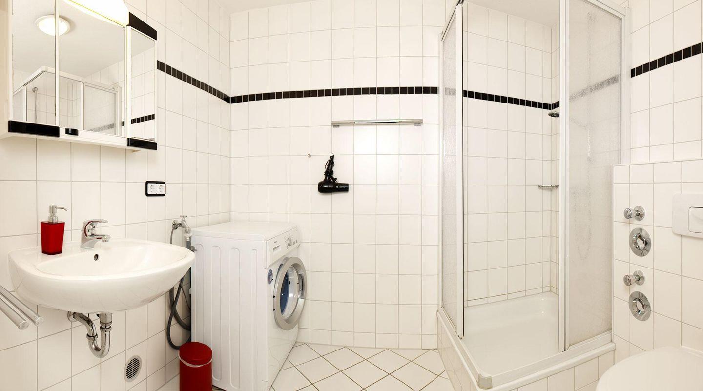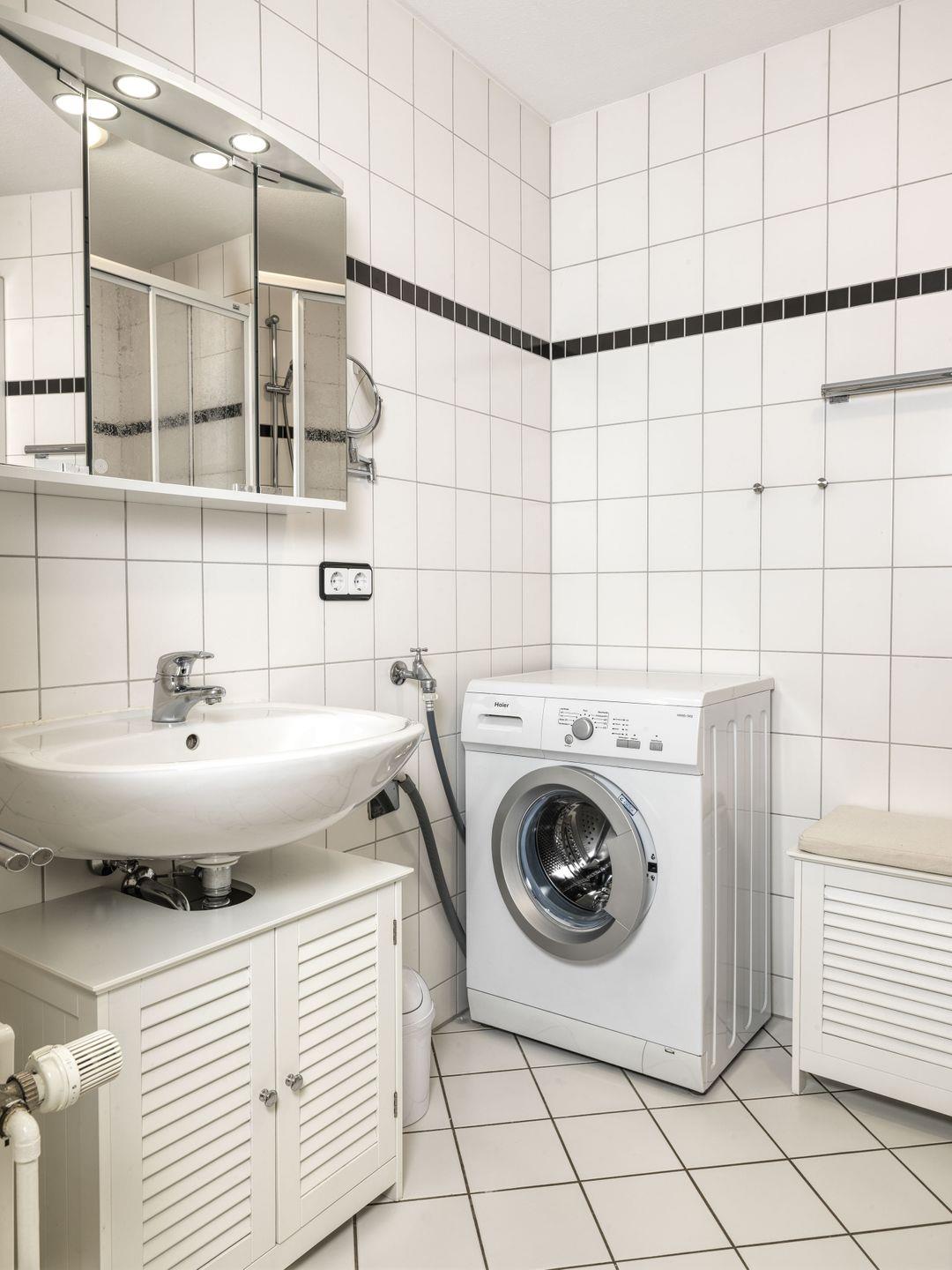 Im Untergeschoß befinden sich ein Schlafzimmer mit Doppelbett, großem Schrank und Flachbild-Fernseher und Fliegengittern. Im hellen Bad finden Sie eine Dusche mit WC und Waschmaschine.