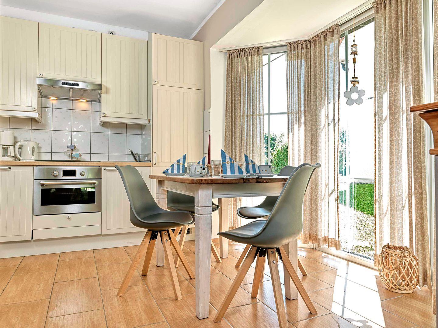 Das Schlafzimmer mit Doppelbett bietet Platz für 2 Personen. Ein weiteres, kleines Schlafzimmer mit einem Etagenbett ist ideal für Kinder. Gemütliches Wohnzimmer mit TV / DVD / Radio sowie einer hübschen Essecke in einem kleinen Erker. Die neue Küchenzeile mit Herd mit Induktionsceranfeld, Kokmbibackofen mit Mikrowelle sowie Geschirrspüler, Waffeleisen, Espressomaschine sowie weiterem Zubehör lässt keine Wünsche offen. Vom Wohnzimmer aus gelangen Sie auf die schöne Terrasse mit Gartenmöbeln, wo Sie ab mittags die Sonne genießen können. Das Bad ist mit Dusche/WC ausgestattet.