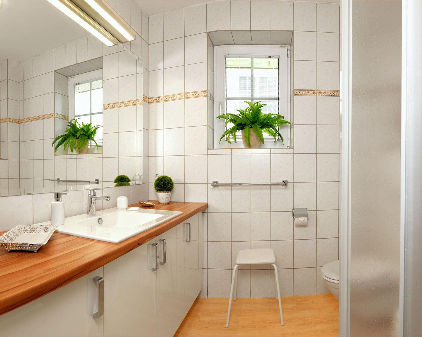 Das Bad mit Dusche / WC lädt zum Wohlfühlen ein! Ein Fußboden in Holzoptik hebt die Wohnlichkeit.