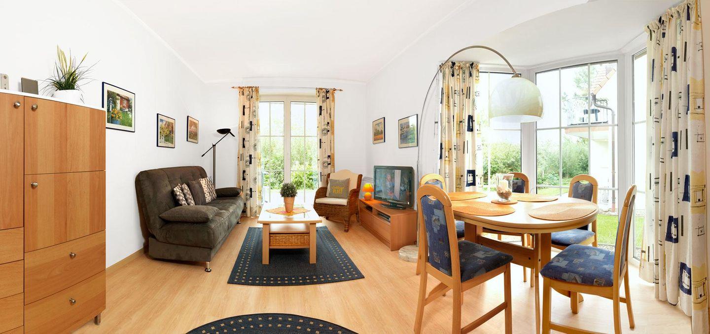 Ein gemütliches, helles Wohnzimmer mit TV /DVD/Radio sowie einer hübschen Essecke in einem kleinen Erker lädt zum Wohlfühlen ein. Direkter Zugang zur geschützten Terrasse in sonniger Süd-Lage mit freiem Blick ins Grüne.