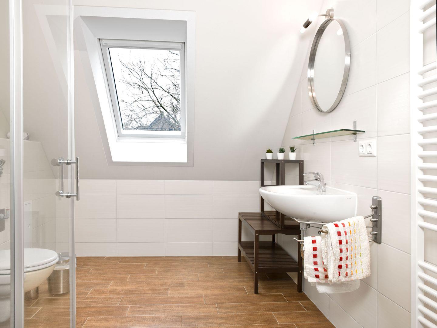 Im Erdgeschoss befindet sich ein separates Schlafzimmer und ein großes Bad, welches auch für gehbehinderte Personen nutzbar ist incl. einer großen, ebenerdigen Dusche .