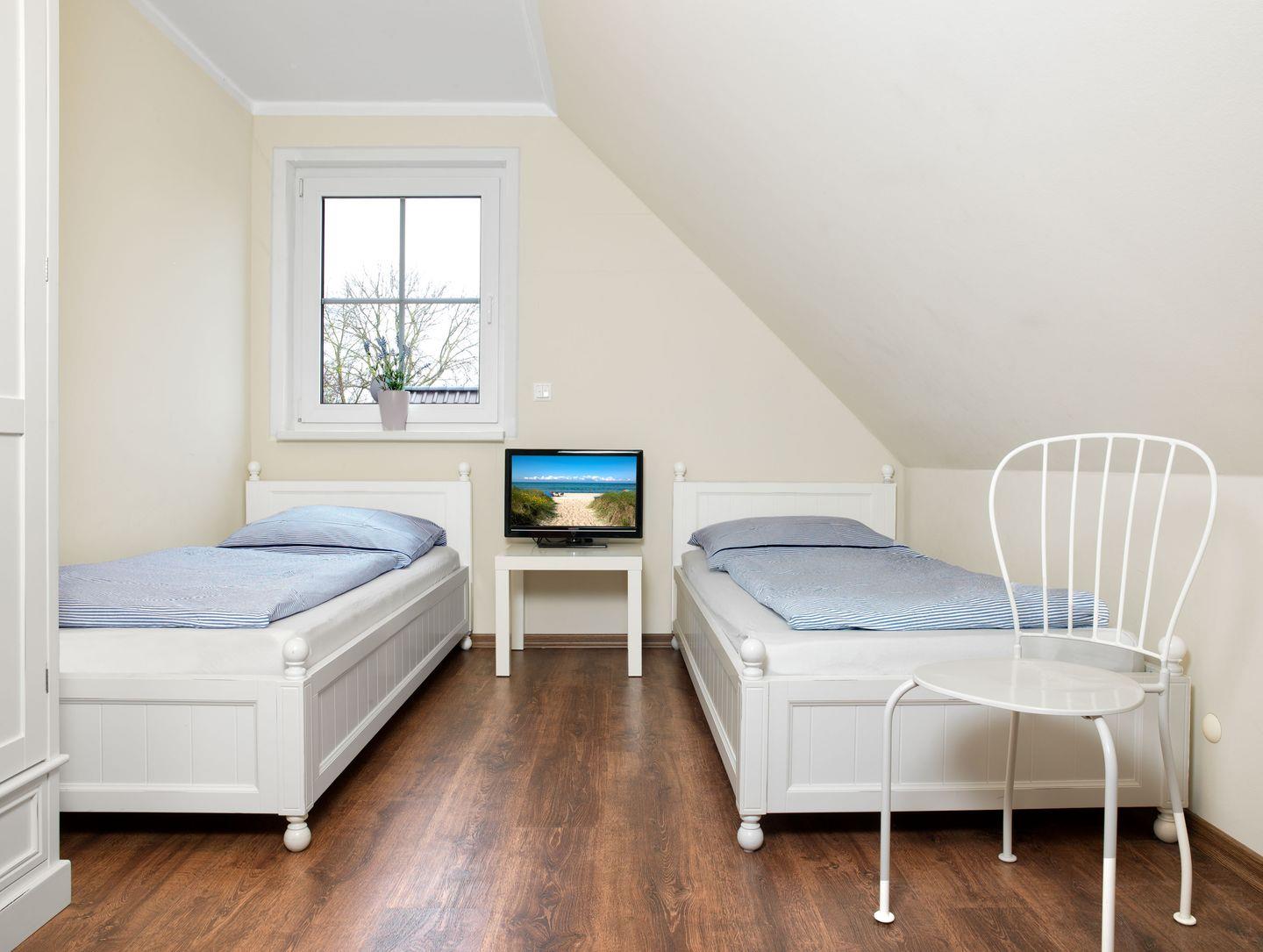 Im Obergeschoss gibt es zwei weitere Schlafzimmer, eines davon mit zusätzlichem TV ausgestattet.