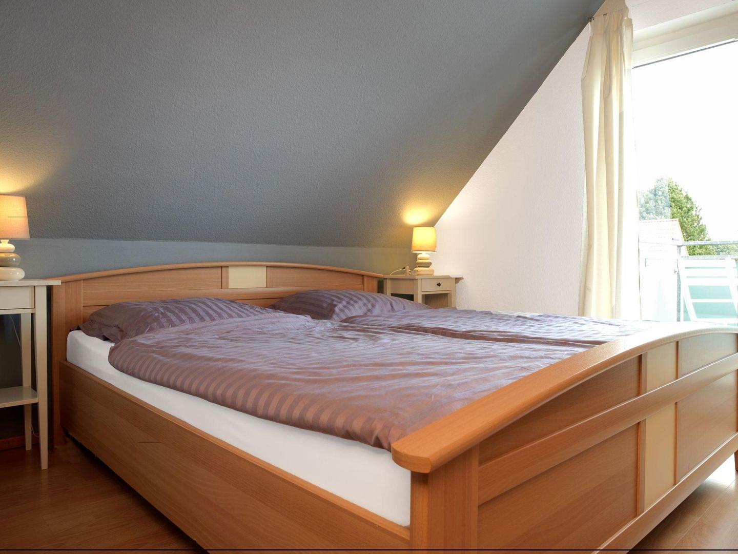 Ein gemütliches Schlafzimmer mit Doppelbett und ein Schlafzimmer mit zwei Einzelbetten erwarten bis zu 4 Personen im OG.