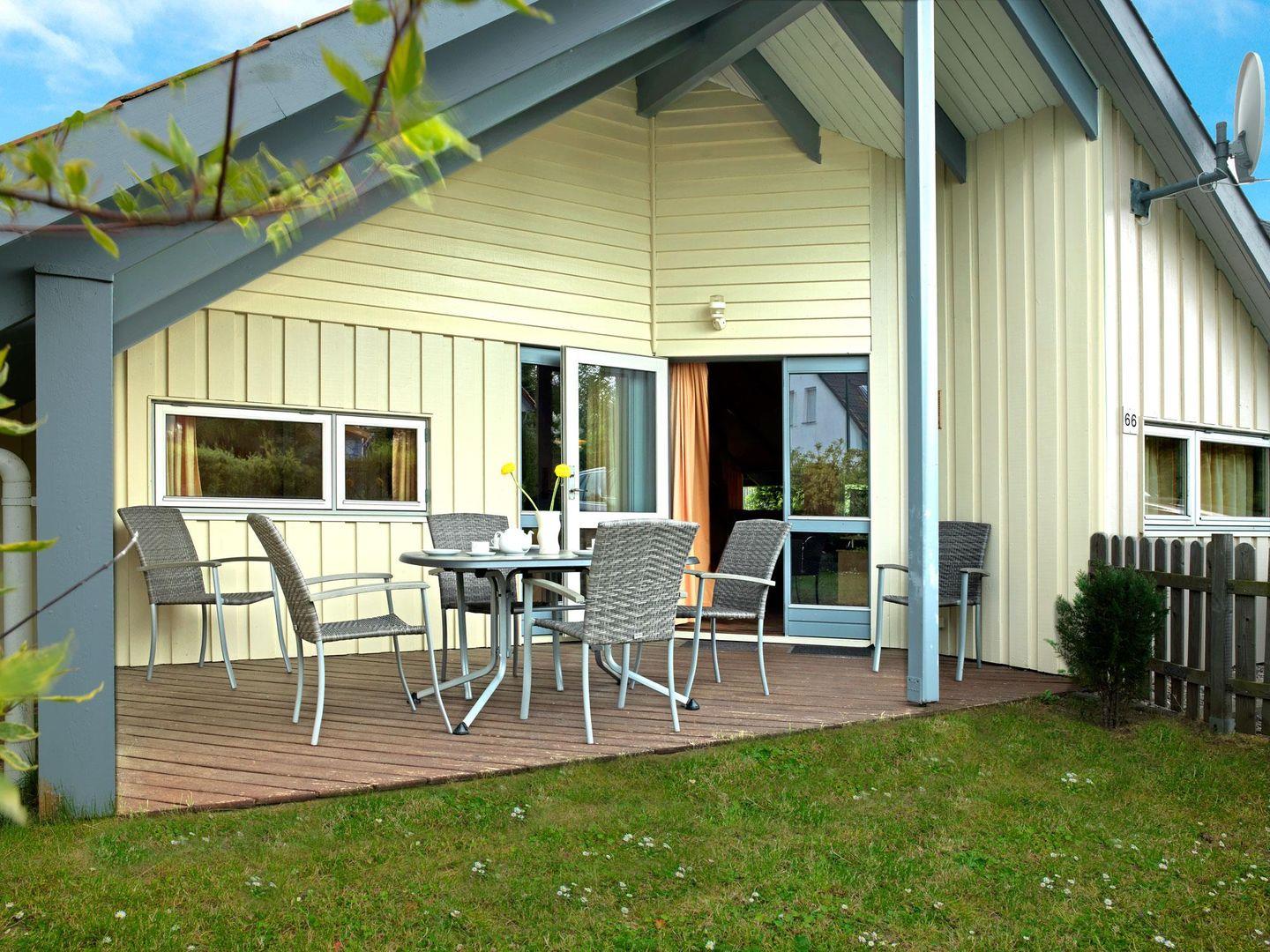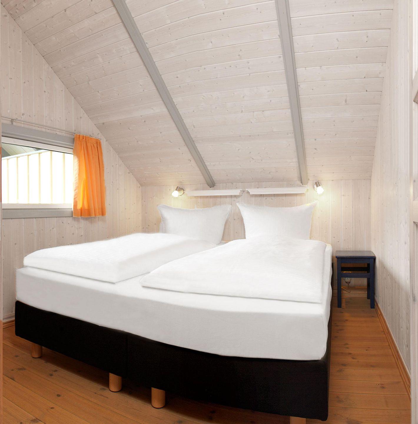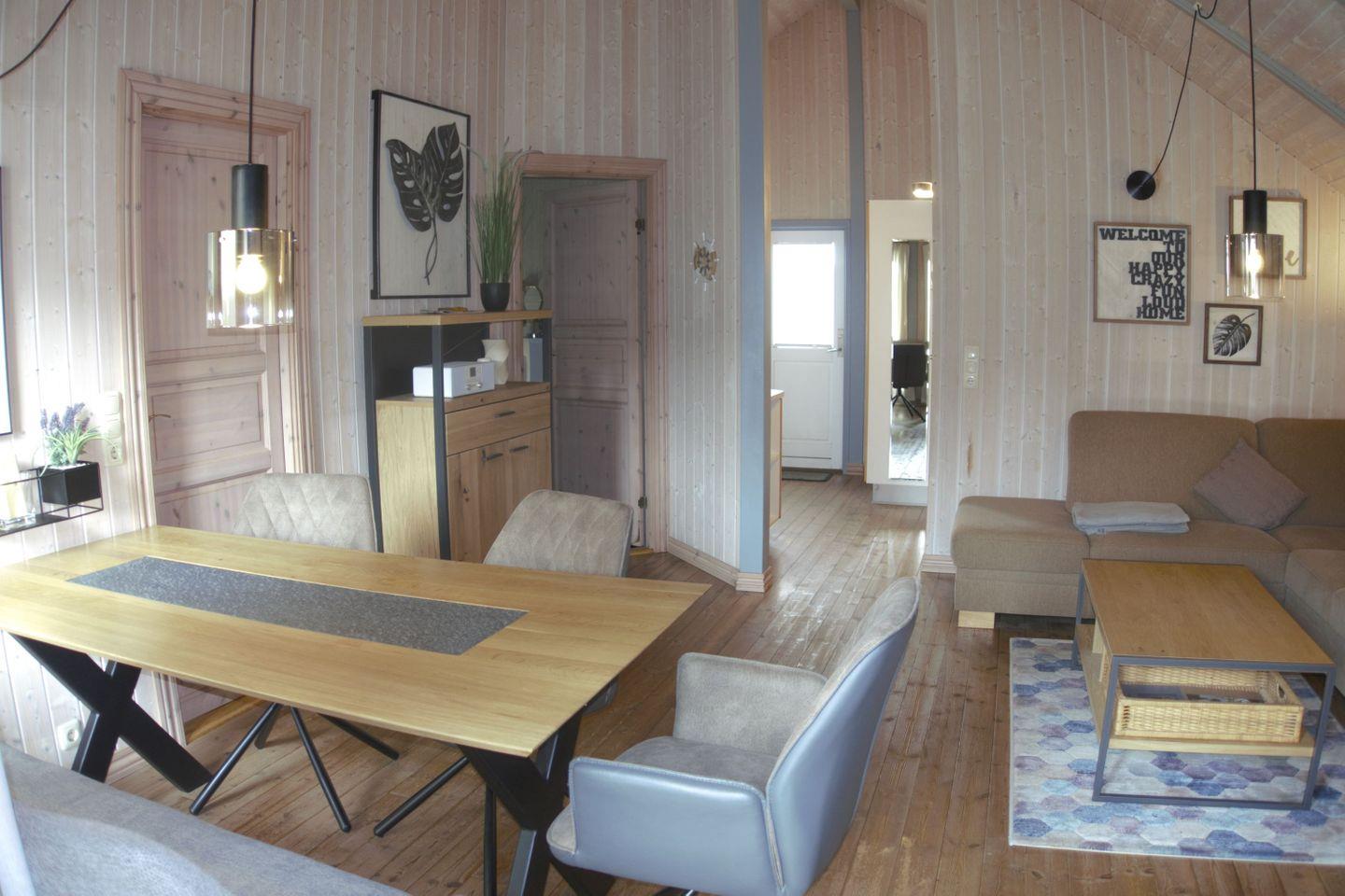 Der Wohnraum mit separater Essecke und Einbauküche ist im nordischen Stil mit Naturholzmöbeln eingerichtet und strahlt eine behagliche Atmosphäre aus. Das Haus verfügt über 2 Schlafzimmer mit je 1 Doppelbett und ein Schlafzimmer mit 1 Einzelbett. Die Küche ist mit Kühlschrank, Mikrowelle, Geschirrspüler und Herd ausgestattet. Im Bad haben Sie die Wahl zwischen Dusche oder Badewanne, des weiteren befindet sich eine Fußbodenheizung und Waschmaschine in diesem Raum.