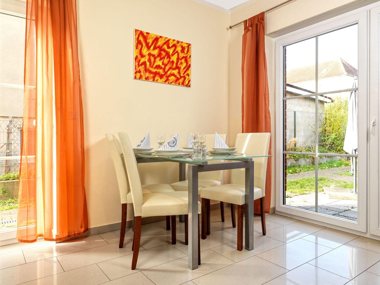 Auf der schönen Terrasse mit Gartenmöbeln können Sie sich von der Sonne verwöhnen lassen.