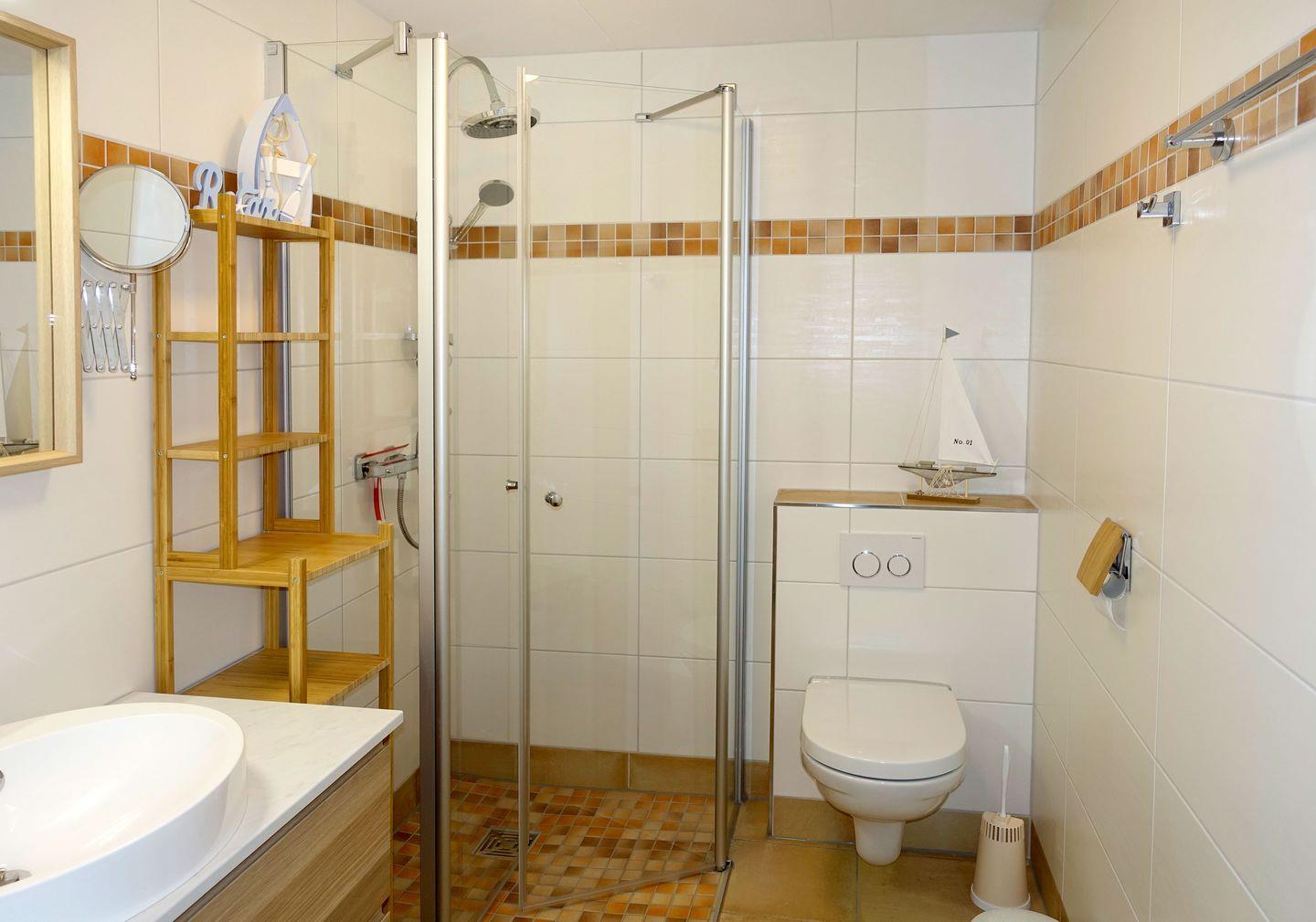 Das Schlafzimmer verfügt über ein Doppelbett. Das Bad ist mit Dusche/WC ausgestattet