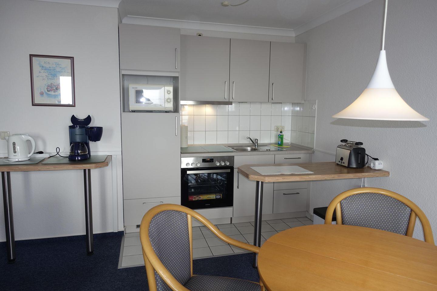 Der großzügige Wohnbereich mit offen gestalteter Küche, die gut ausgestattet ist, u.a. Kühlschrank, Backofen, Mikrowelle, Kaffeemaschine etc.